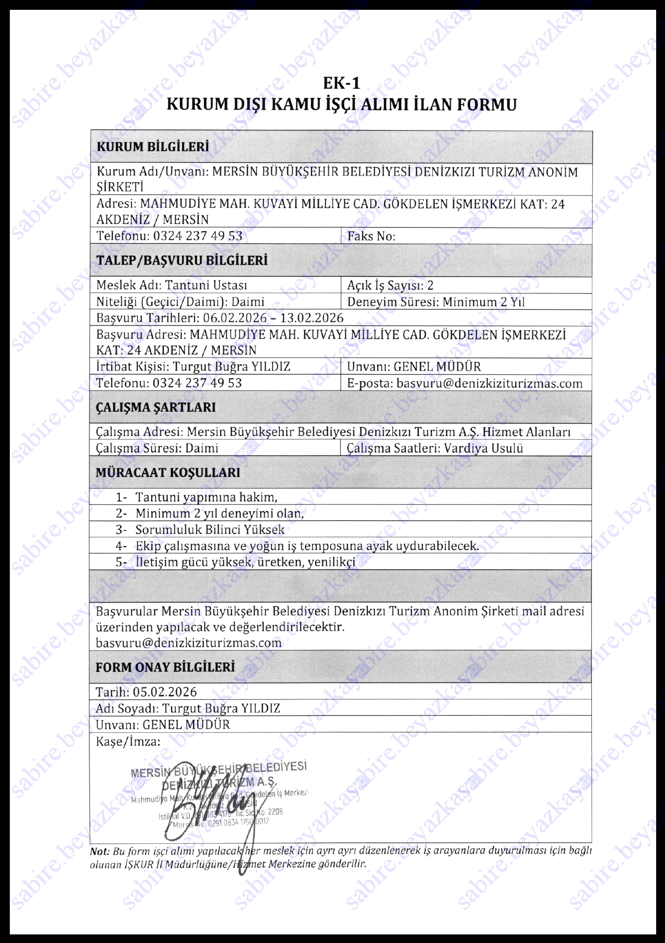Ana sayfaDaimi İşçi İlanları Mersin Büyükşehir Belediyesi 4 İşçi Alacak Mersin Büyükşehir Belediyesi 4 İşçi Alacak. Son başvuru tarihi 13 Şubat 2026 Kaynak : İşkur İlan Giriş : 06 Şubat 2026 22:50, Son Güncelleme : 06 Şubat 2026 22:22 Yazdır Yorumlar (0) Abone Ol