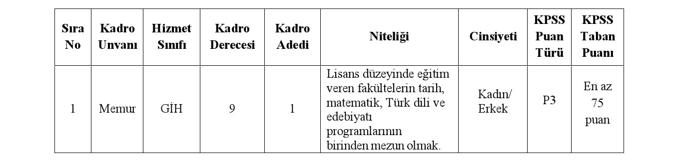 Tokat ili Tanoba Belediye Başkanlığı bünyesinde, 657 sayılı Devlet Memurları Kanununa tabi olarak istihdam edilmek üzere; Mahalli İdarelere İlk Defa Atanacaklara Dair Sınav ve Atama Yönetmeliği hükümlerine göre aşağıda unvanı, sınıfı, derecesi, adedi, nitelikleri, KPSS puan türü, KPSS taban puanı ve diğer şartları taşımak kaydıyla belirtilen boş kadroya açıktan atama yoluyla memur alınacaktır.