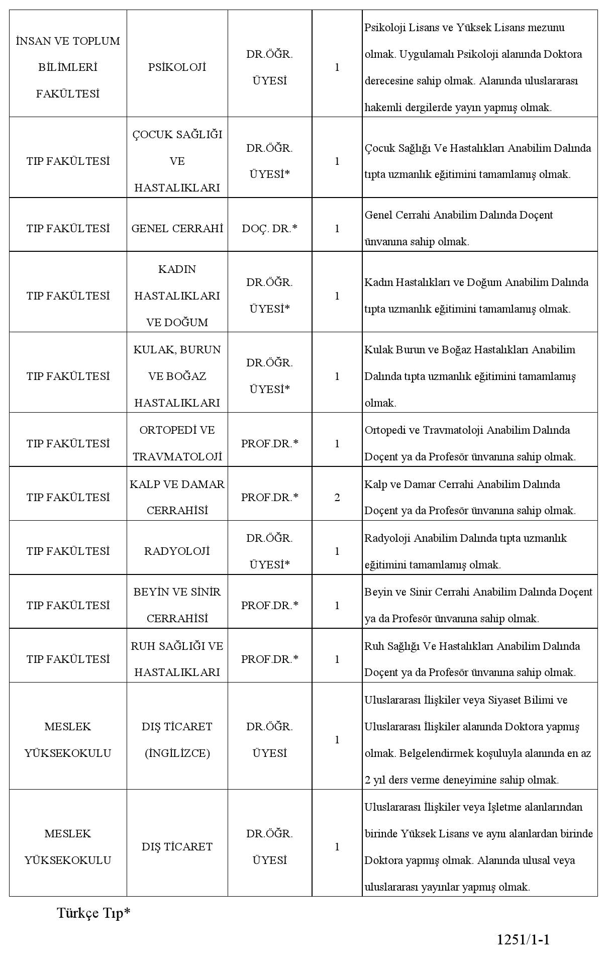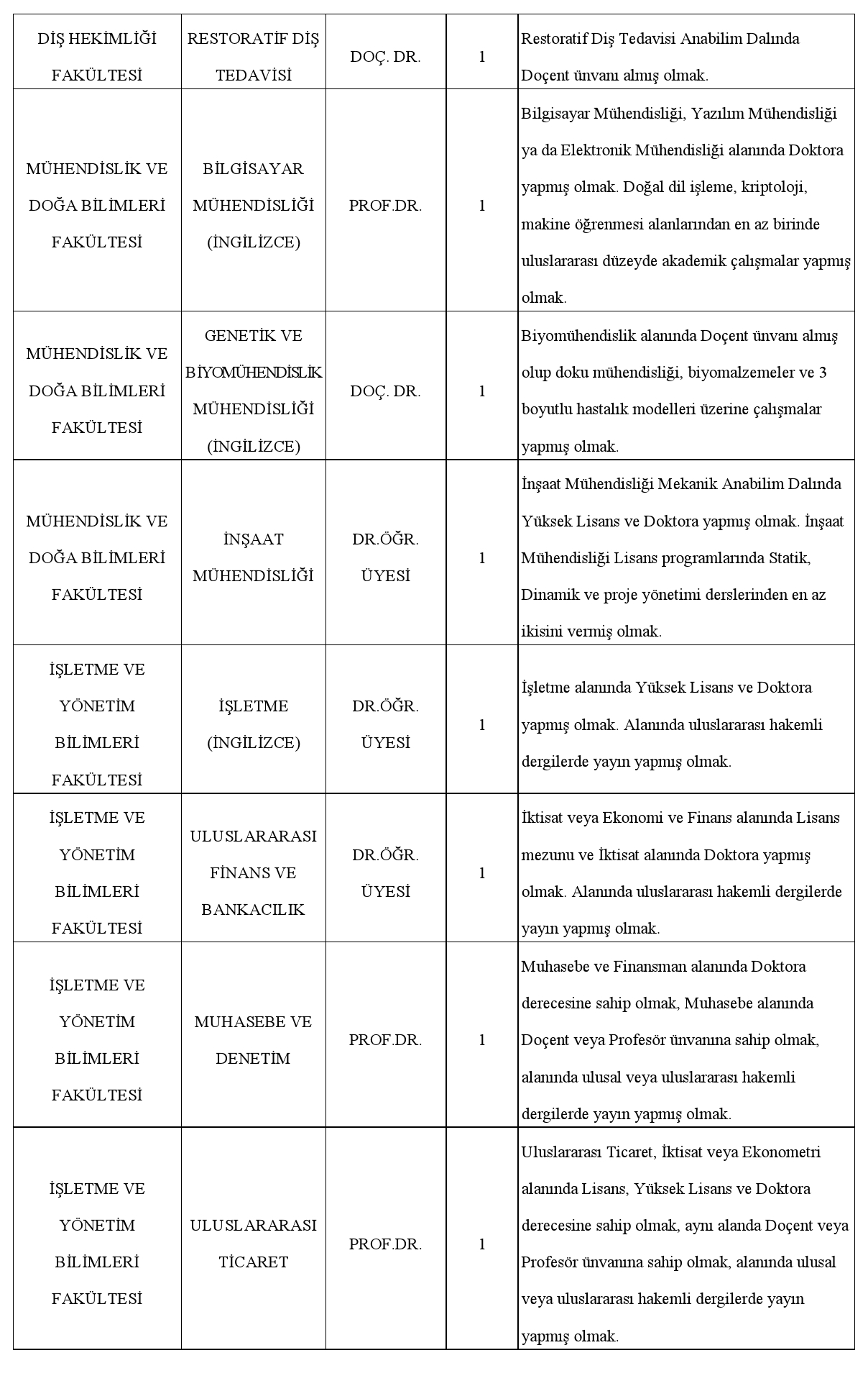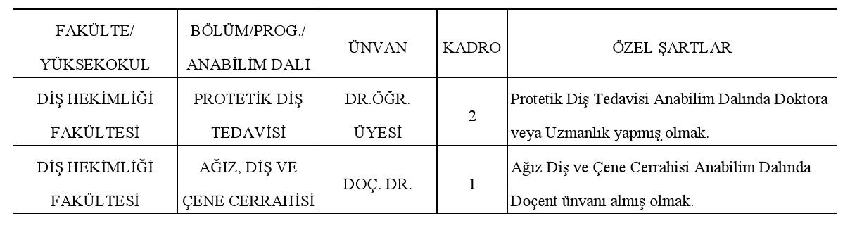 Üniversitemize 2547 sayılı Yükseköğretim Kanunu ve 12.06.2018 tarihli ve 30449 sayılı Resmi Gazete'de yayımlanarak yürürlüğe giren "Öğretim Üyeliği Yükseltilme ve Atanma Yönetmeliği'nin" ilgili maddeleri uyarınca aşağıda nitelikleri belirtilen kadrolara Öğretim Üyeleri alınacaktır.