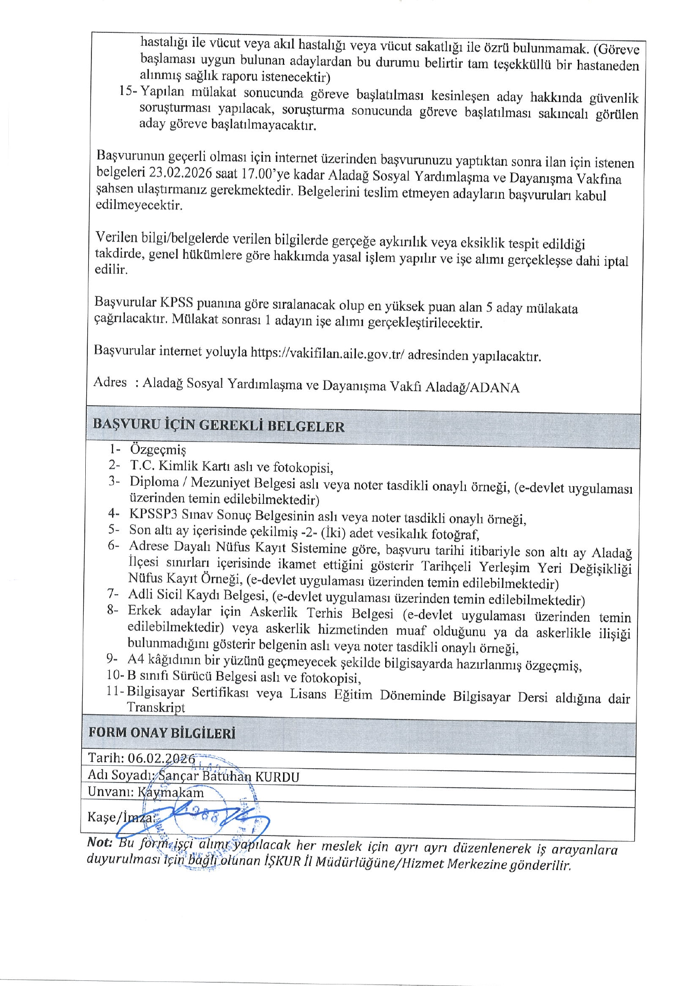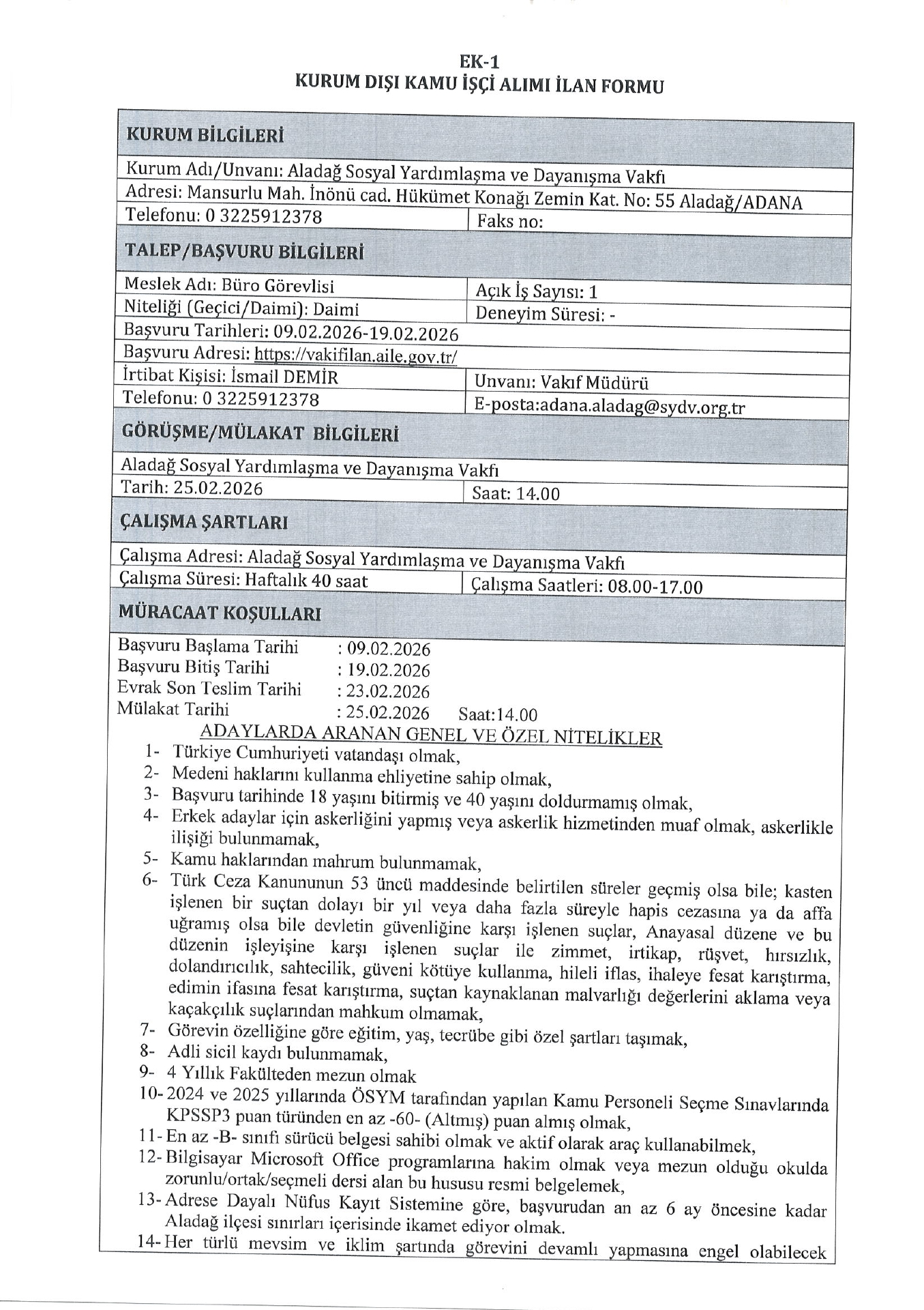 Ana sayfaDaimi İşçi İlanlarıAna sayfaSYDV İlanları Adana Aladağ SYDV 1 İşçi Alacak Adana Aladağ SYDV 1 İşçi Alacak. Son başvuru tarihi 19 Şubat 2026 Kaynak : İşkur İlan Giriş : 09 Şubat 2026 22:17, Son Güncelleme : 09 Şubat 2026 23:25 Yazdır Yorumlar (0) Abone Ol