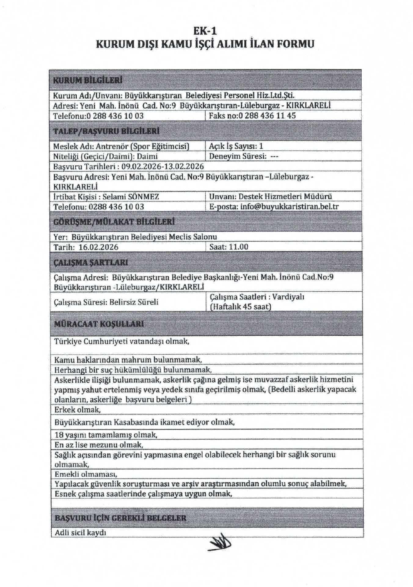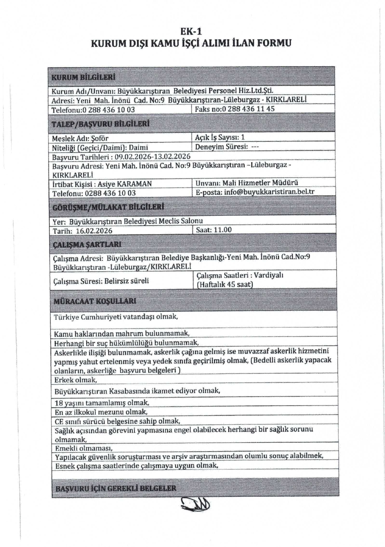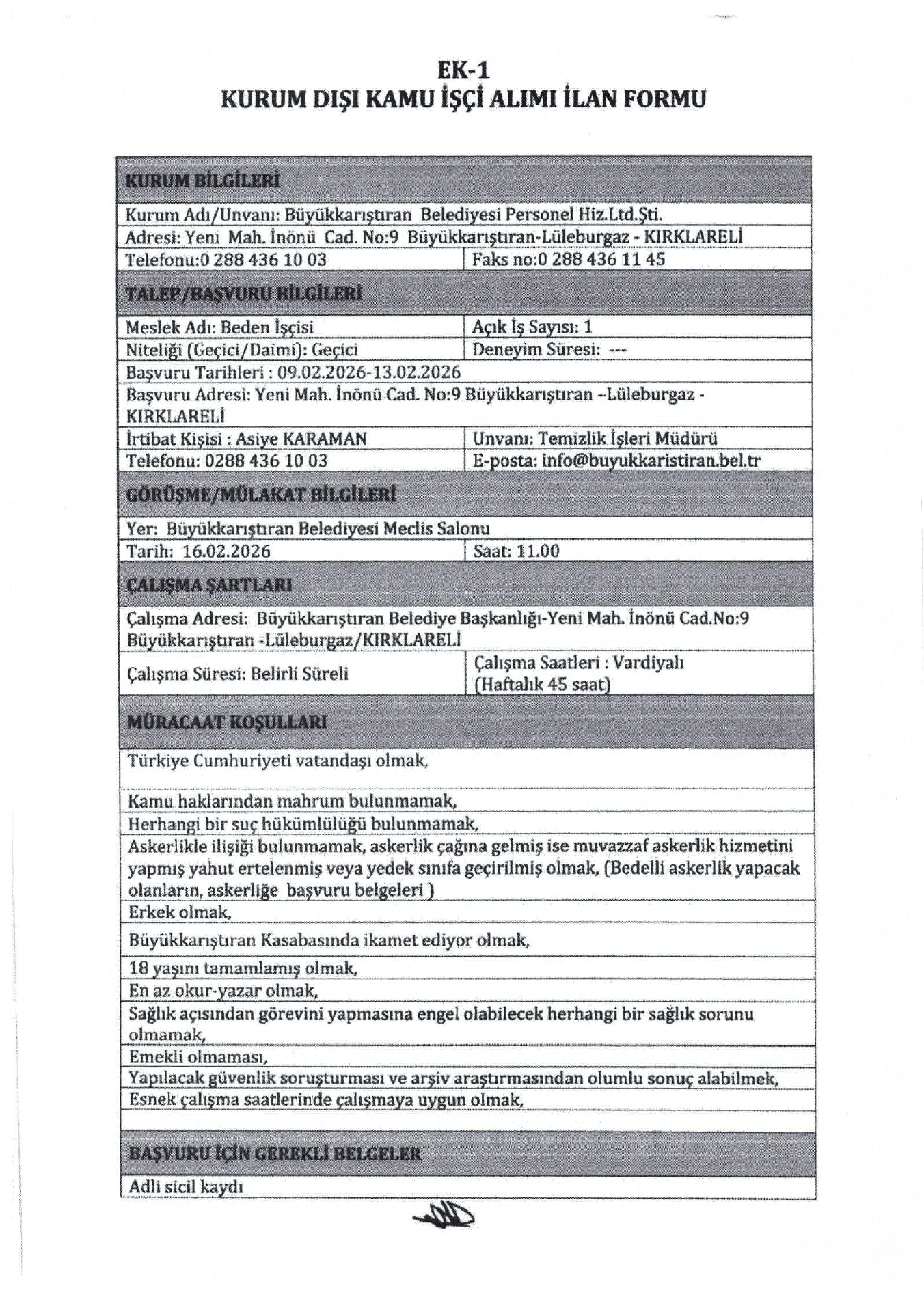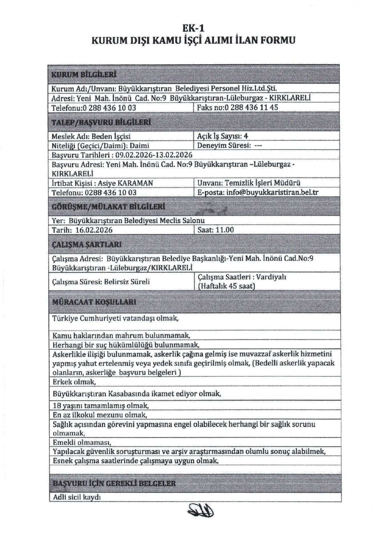 Ana sayfaDaimi İşçi İlanları Kırklareli Büyükkarıştıran Belediyesi 14 İşçi Alacak Kırklareli Büyükkarıştıran Belediyesi 14 İşçi Alacak. Son başvuru tarihi 13 Şubat 2026 Kaynak : İşkur İlan Giriş : 09 Şubat 2026 22:35, Son Güncelleme : 09 Şubat 2026 23:18 Yazdır Yorumlar (0) Abone Ol