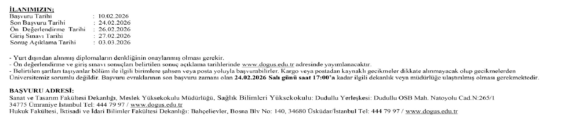 Doğuş Üniversitesi Öğretim Üyesi ve Elemanı Alım İlanı. Son başvuru tarihi 24 Şubat 2026