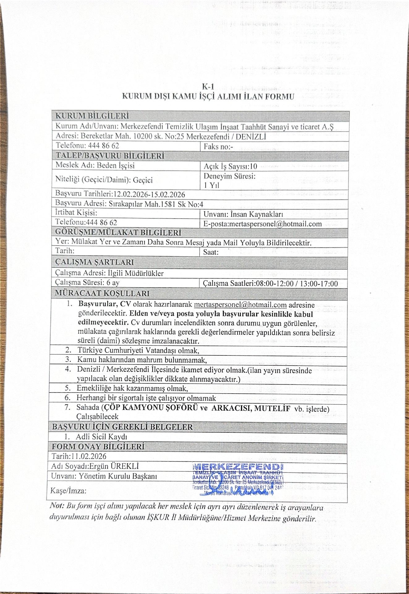 Ana sayfaGeçici İşçi İlanları Denizli Merkezefendi Temizlik Geçici 10 İşçi Alacak Denizli Merkezefendi Temizlik Geçici 10 İşçi Alacak. Son başvuru tarihi 15 Şubat 2026 Kaynak : İşkur İlan Giriş : 11 Şubat 2026 22:50, Son Güncelleme : 11 Şubat 2026 23:11 Yazdır Yorumlar (0) Abone Ol