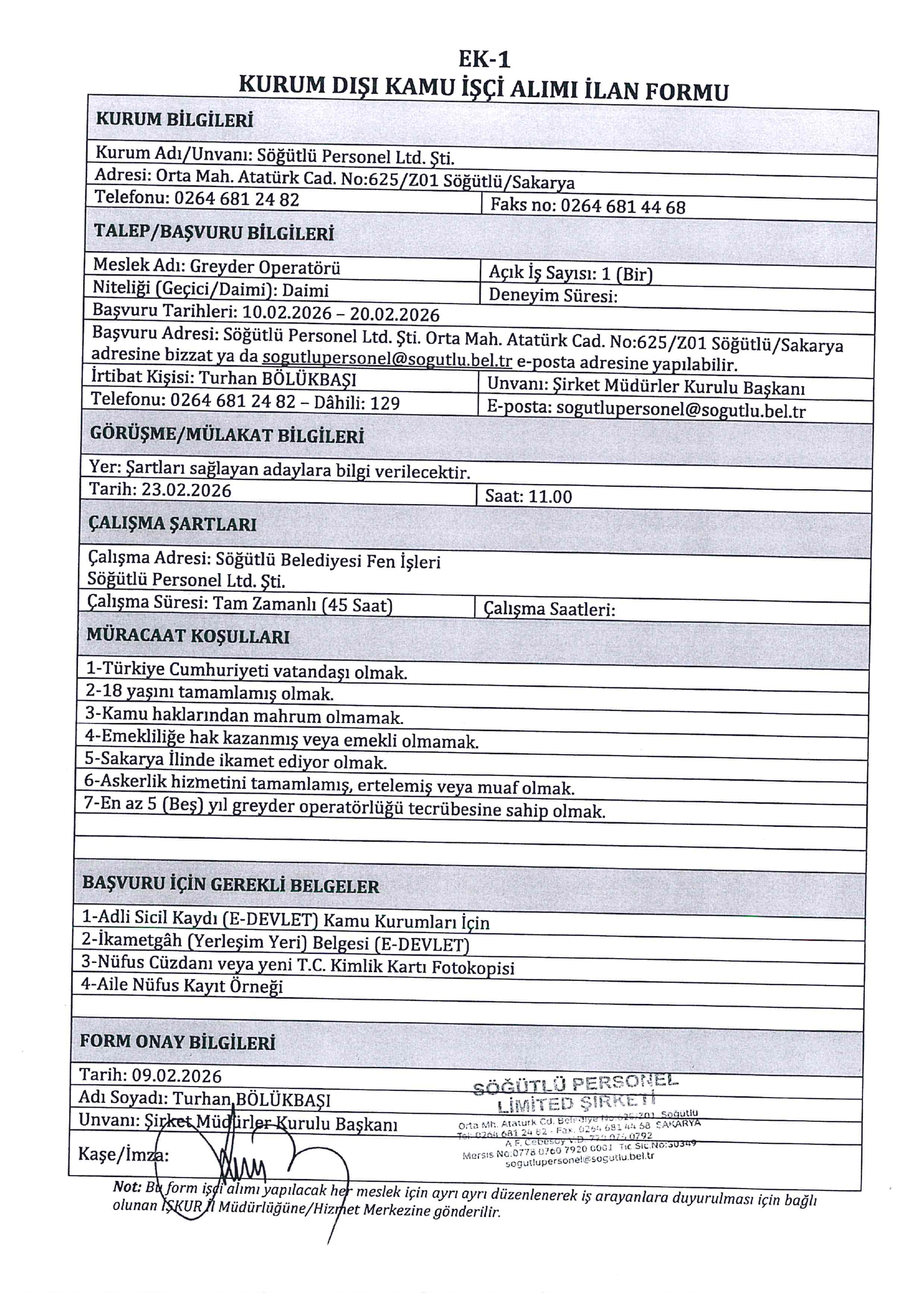 Sakarya Söğütlü Belediyesi 1 İşçi Alacak. Son başvuru tarihi 20 Şubat 2026