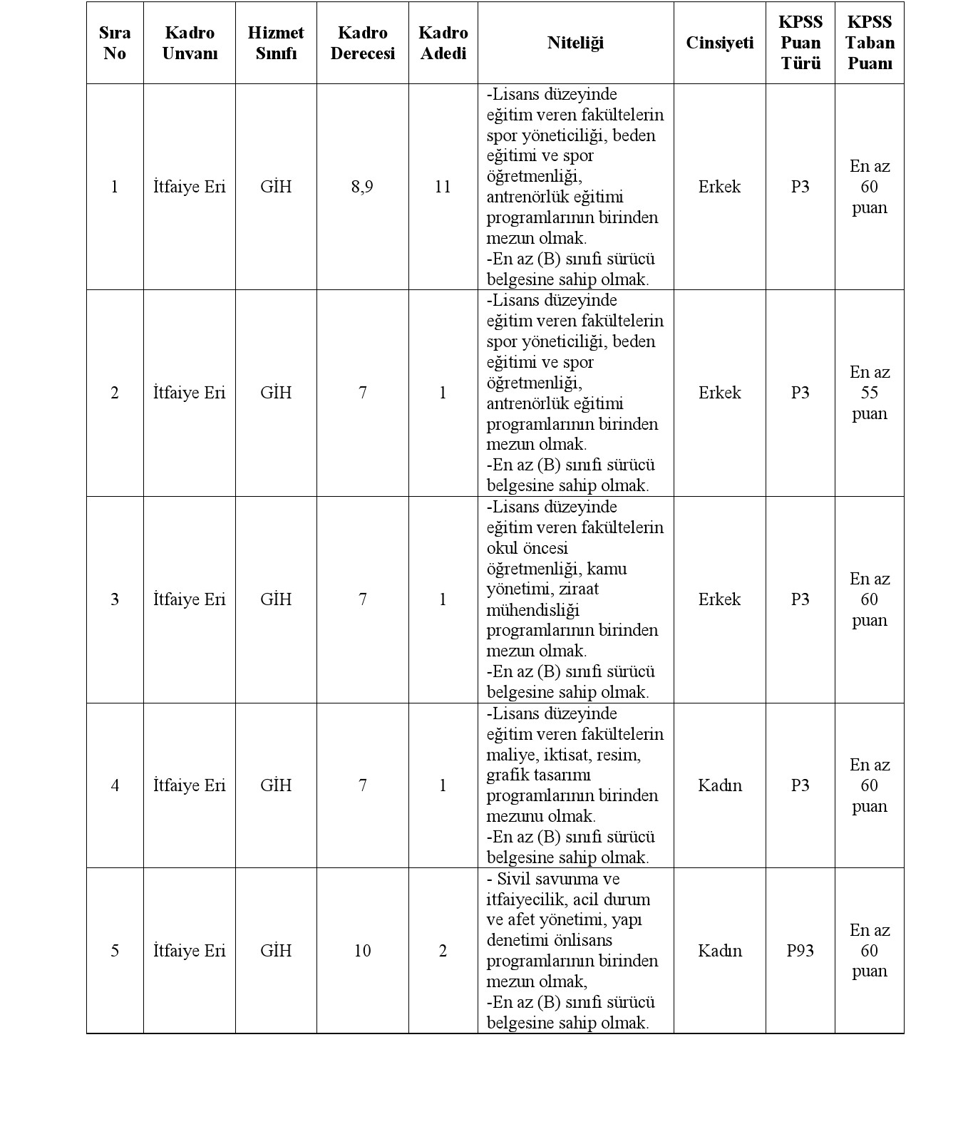 Tokat Belediye Başkanlığı bünyesinde, 657 sayılı Devlet Memurları Kanununa tabi olarak istihdam edilmek üzere; Belediye İtfaiye Yönetmeliği hükümlerine göre aşağıda unvanı, sınıfı, derecesi, adedi, nitelikleri, KPSS puan türü, KPSS taban puanı ve diğer şartları taşımak kaydıyla belirtilen boş kadrolara açıktan atama yoluyla itfaiye eri alımı yapılacaktır.