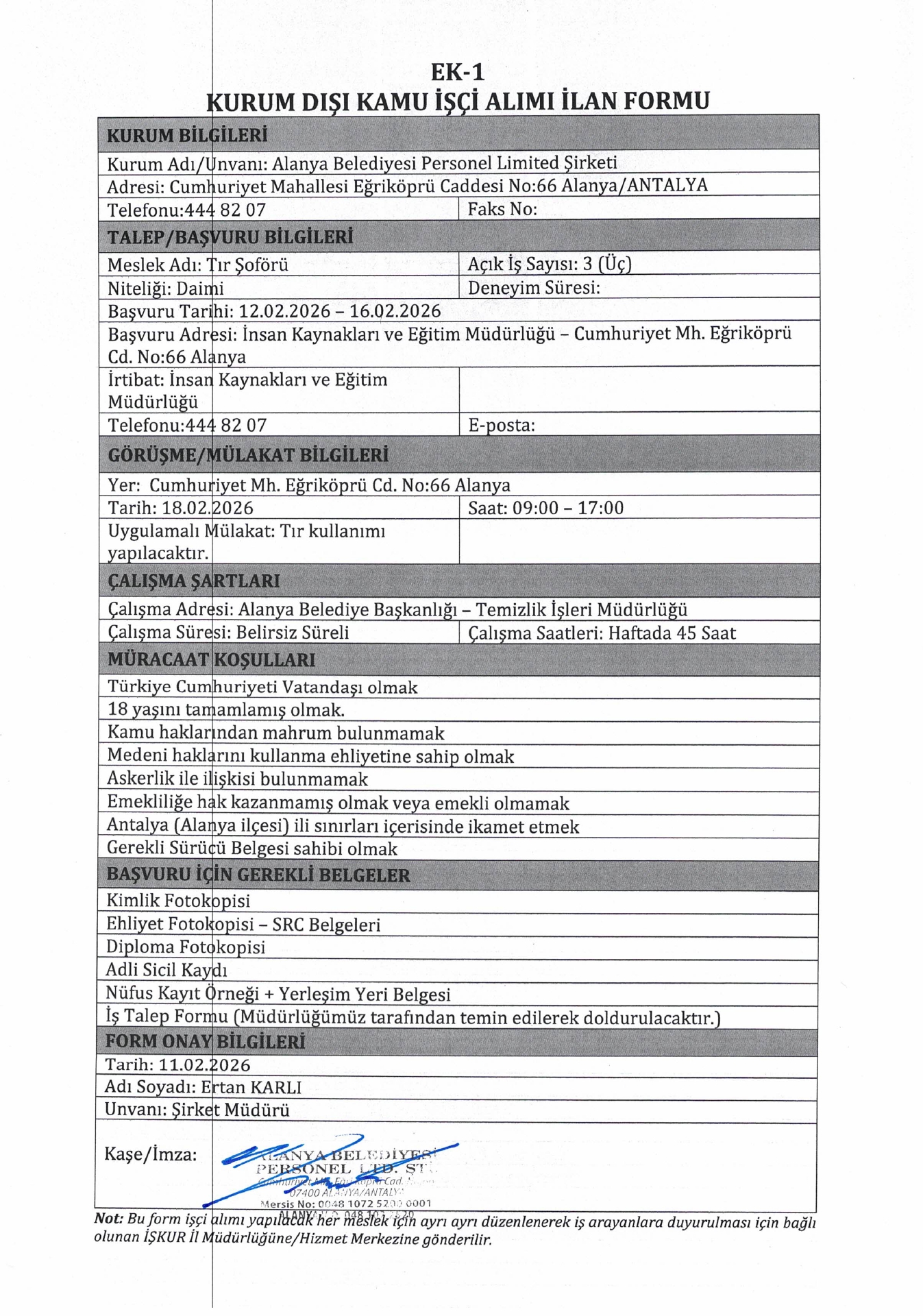 Ana sayfaDaimi İşçi İlanları Alanya Belediyesi 3 İşçi Alacak Alanya Belediyesi 3 İşçi Alacak. Son başvuru tarihi 16 Şubat 2026 Kaynak : İşkur İlan Giriş : 12 Şubat 2026 23:34, Son Güncelleme : 12 Şubat 2026 23:49 Yazdır Yorumlar (0) Abone Ol