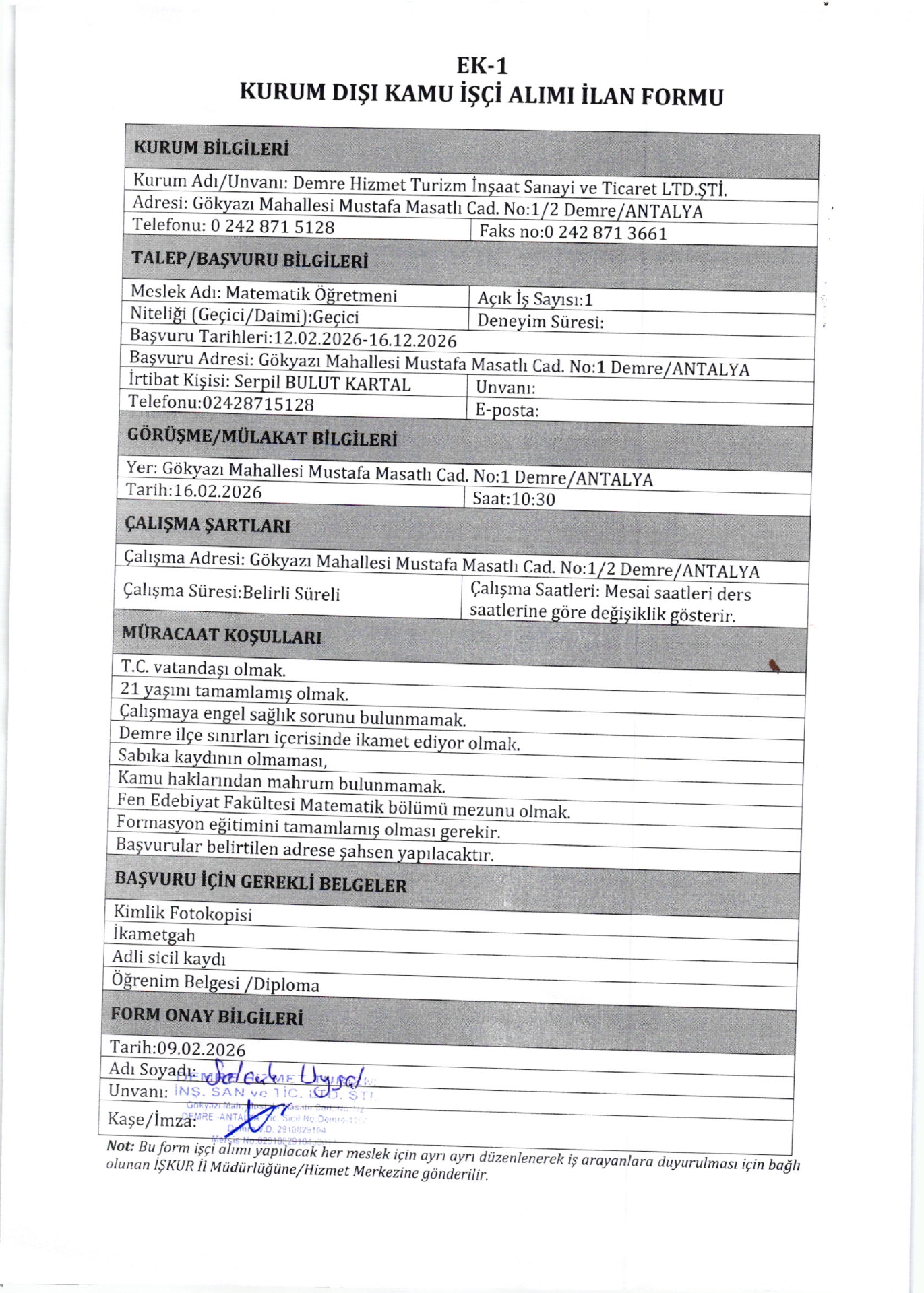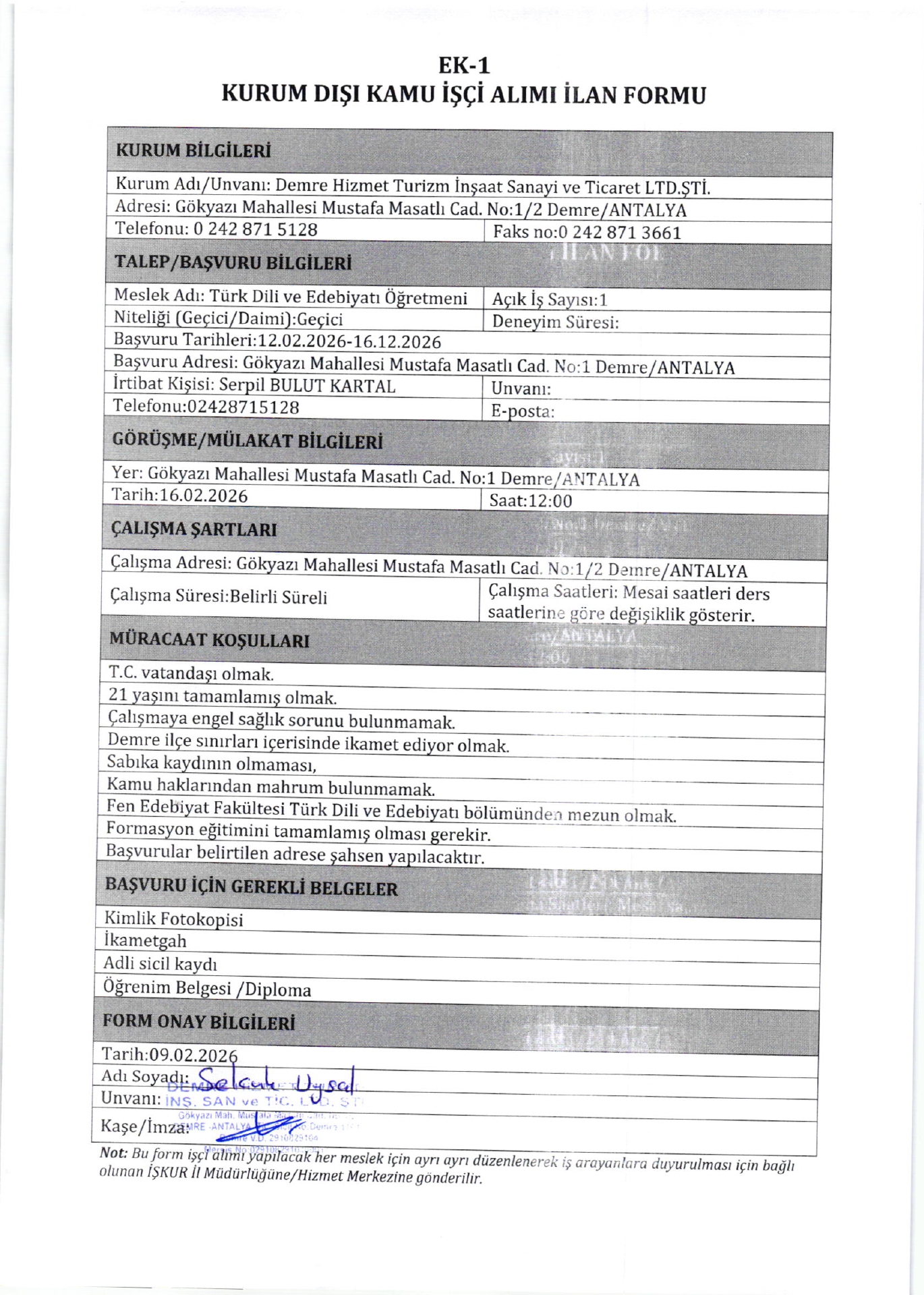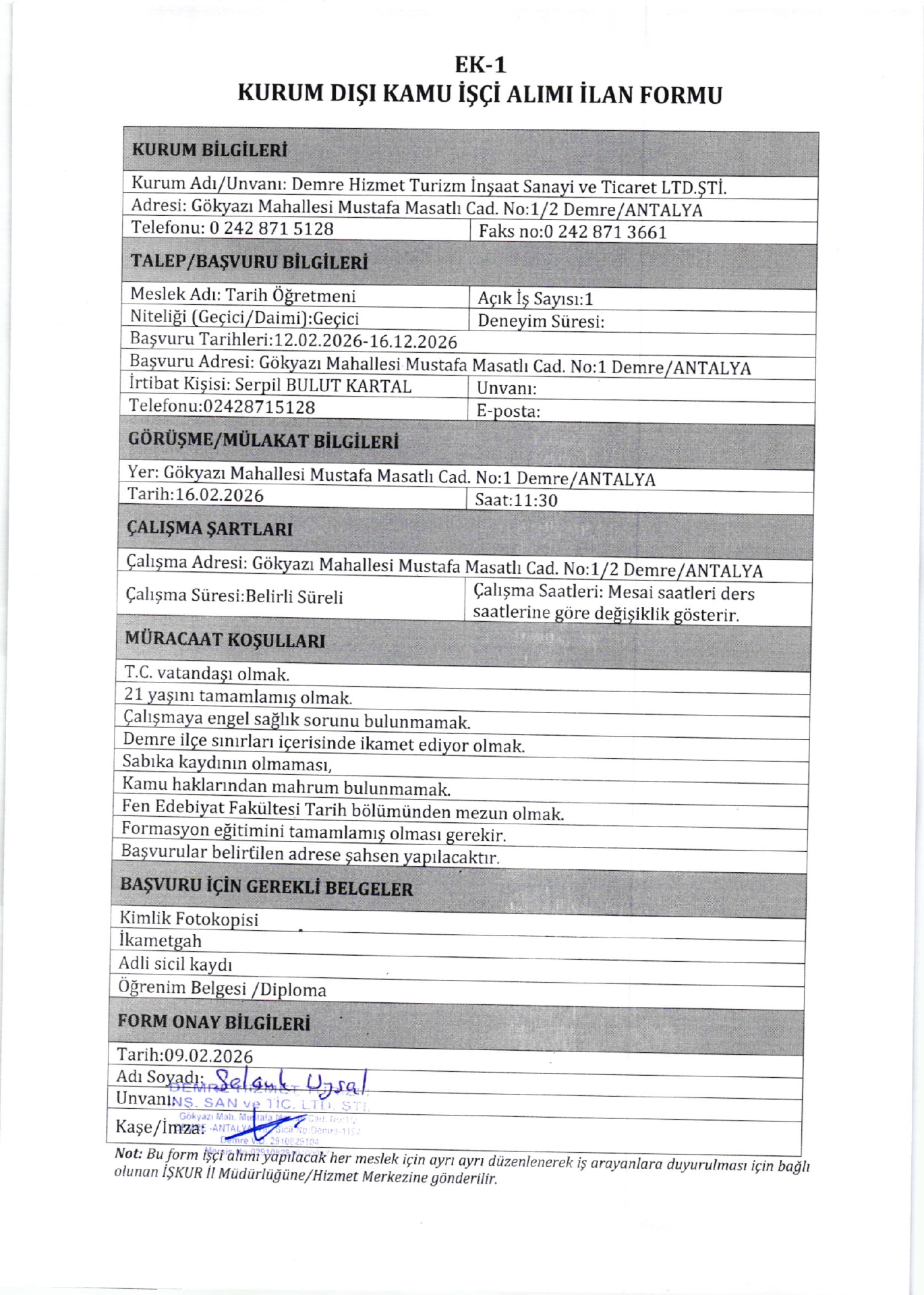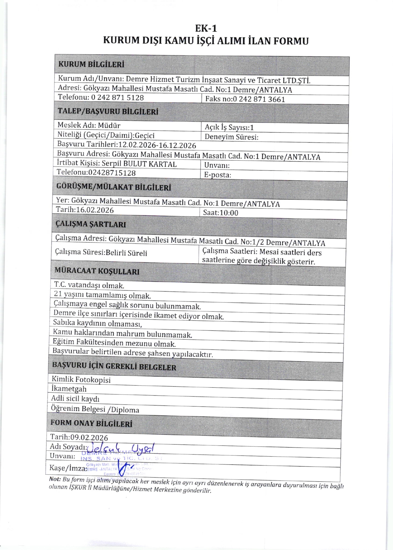 Ana sayfaDaimi İşçi İlanları Antalya Demre Hizmet Geçici 6 İşçi Alacak Antalya Demre Hizmet Geçici 6 İşçi Alacak. Son başvuru tarihi 16 Şubat 2026 Kaynak : İşkur İlan Giriş : 12 Şubat 2026 23:37, Son Güncelleme : 12 Şubat 2026 23:49 Yazdır Yorumlar (0) Abone Ol