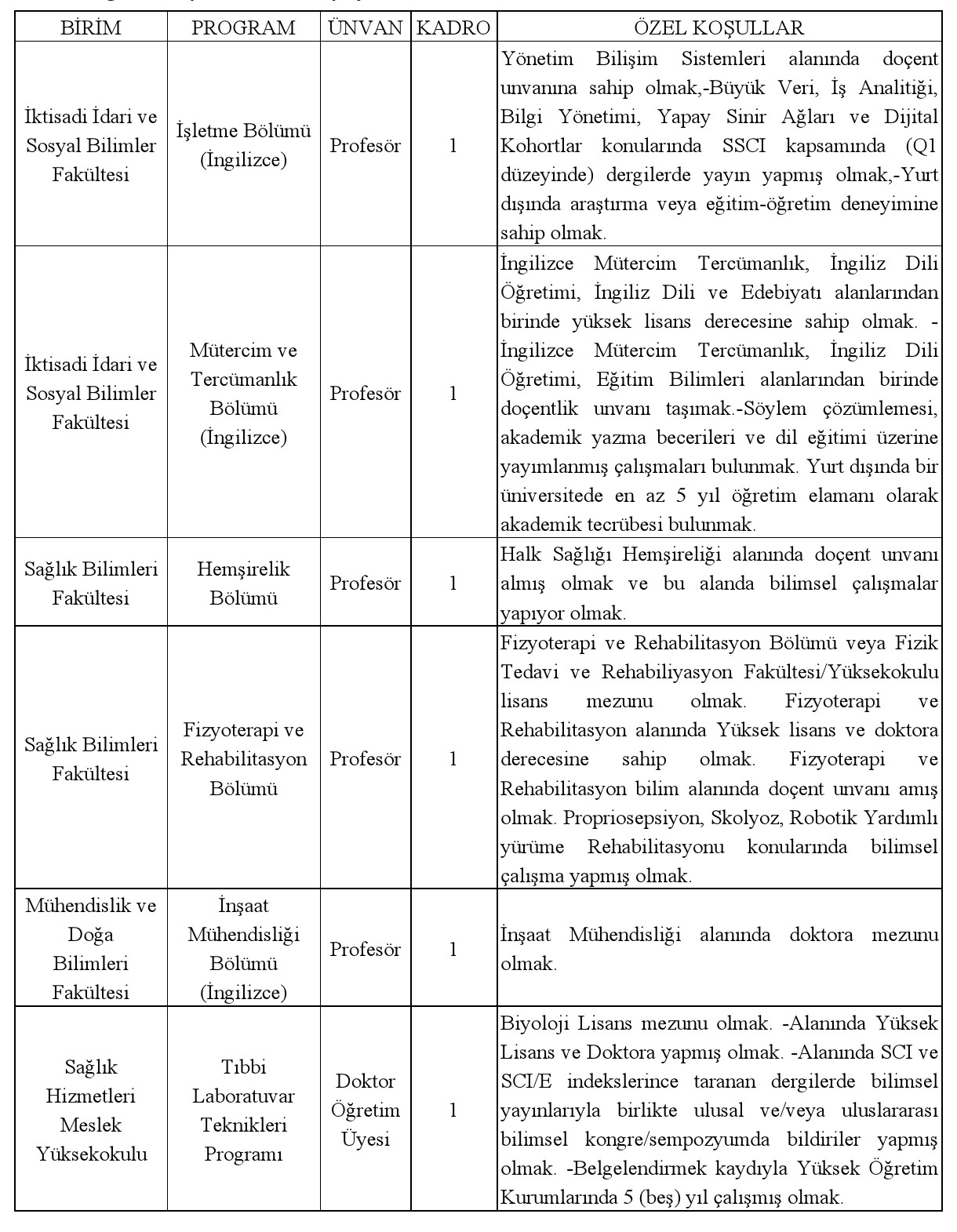 Üniversitemiz 4857 sayılı İş Kanunu hükümlerine tabi olarak, Üniversitemiz birimlerine 2547 sayılı Yükseköğretim Kanunu'nun, Öğretim Üyeliğine Yükseltilme ve Atanma Yönetmeliği'nin ve Öğretim Üyesi Dışındaki Öğretim Elemanı Kadrolarına Yapılacak Atamalarda Uygulanacak Merkezi Sınav ile Giriş Sınavlarına İlişkin Usul ve Esaslar Hakkında Yönetmelik"in ilgili hükümleri gereğince, aşağıdaki tabloda belirtilen kadrolara öğretim elemanları alınacaktır.