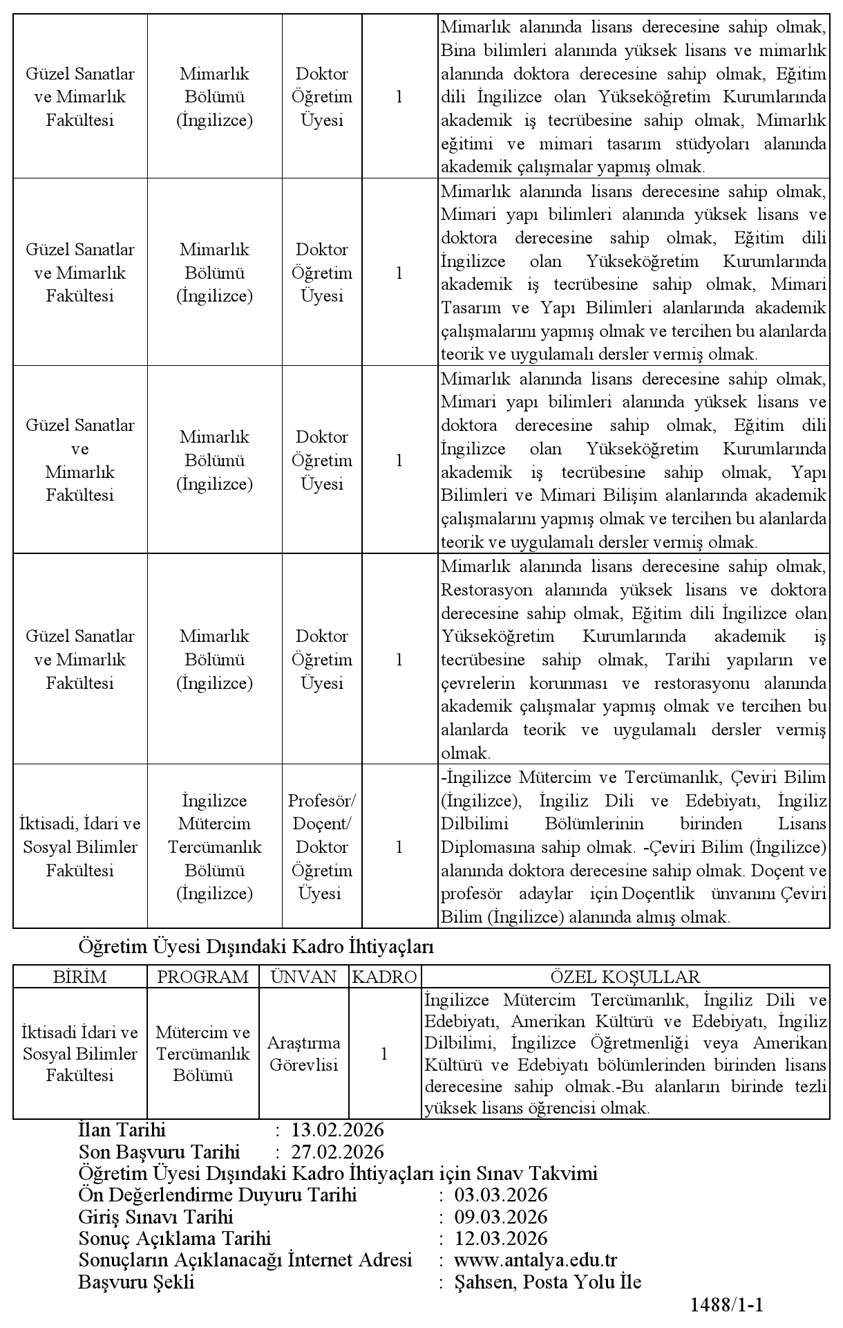 . İlana ilişkin ayrıntılı bilgilere, istenen belgelere ve formlara www.antalya.edu.tr adresinden ulaşılabilir.