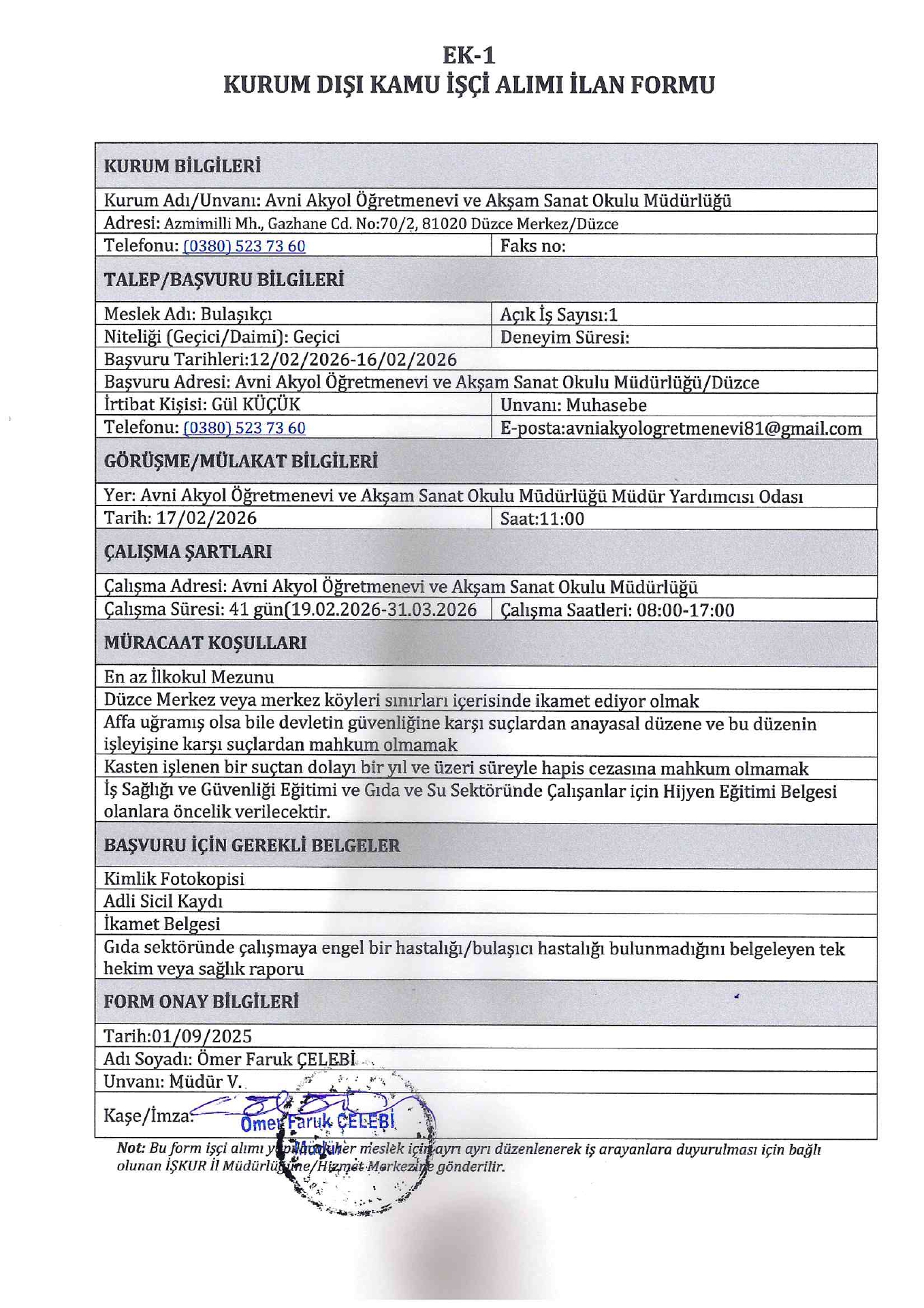 Düzce Avni Akyol Öğretmenevi Geçici 1 İşçi Alacak. Son başvuru tarihi 16 Şubat 2026