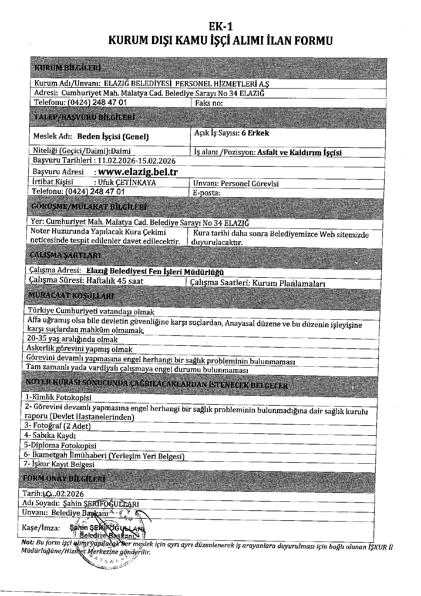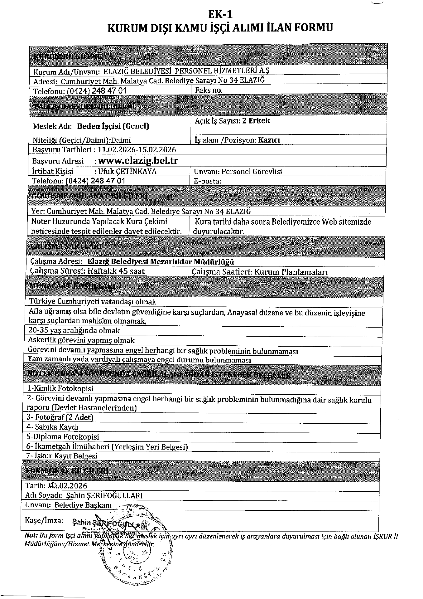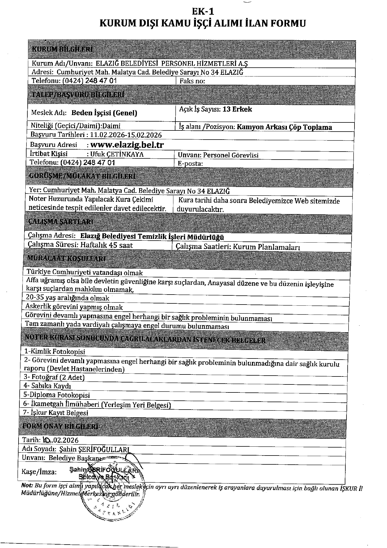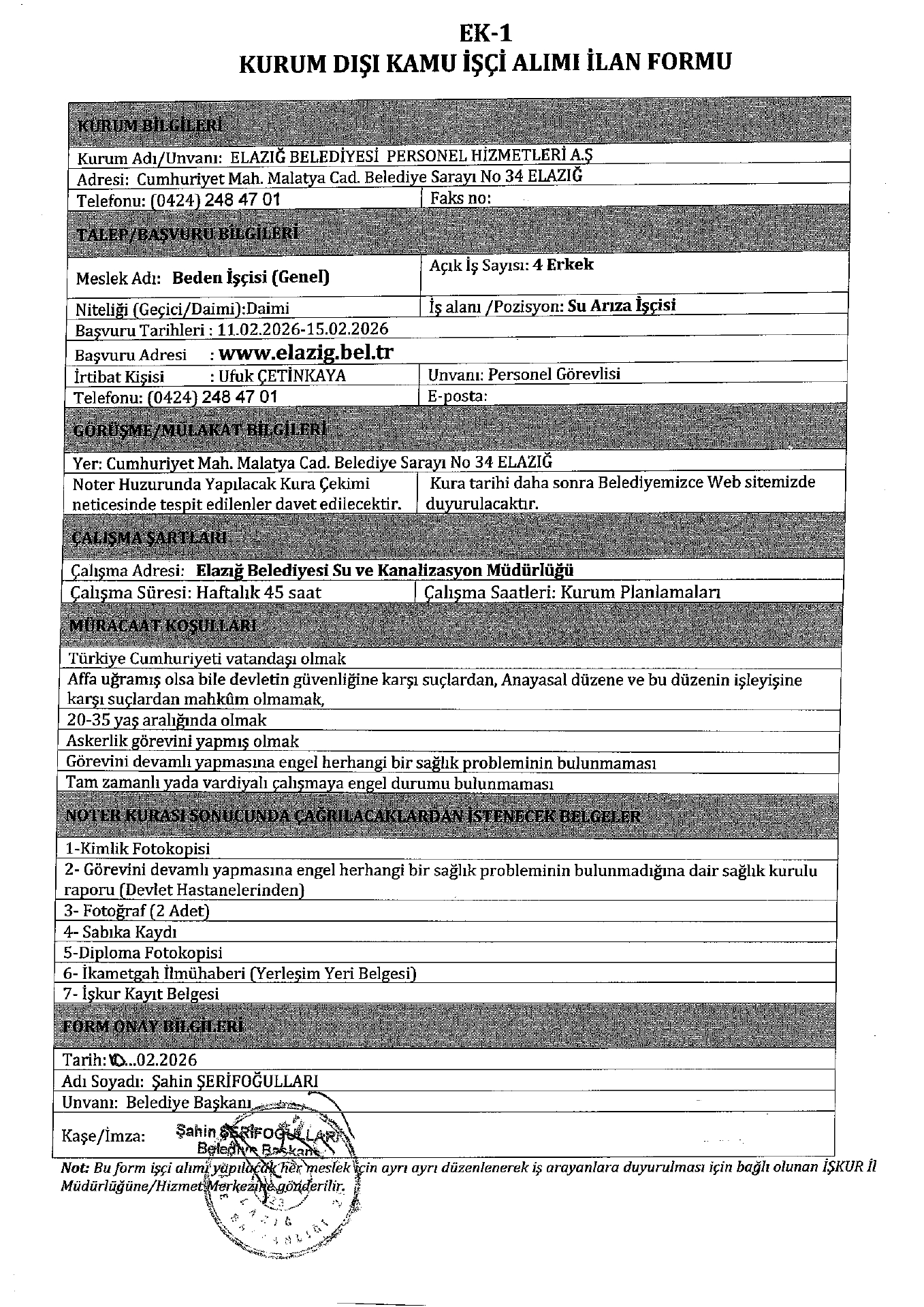 Elazığ Belediyesi 25 İşçi Alacak. Son başvuru tarihi 15 Şubat 2026