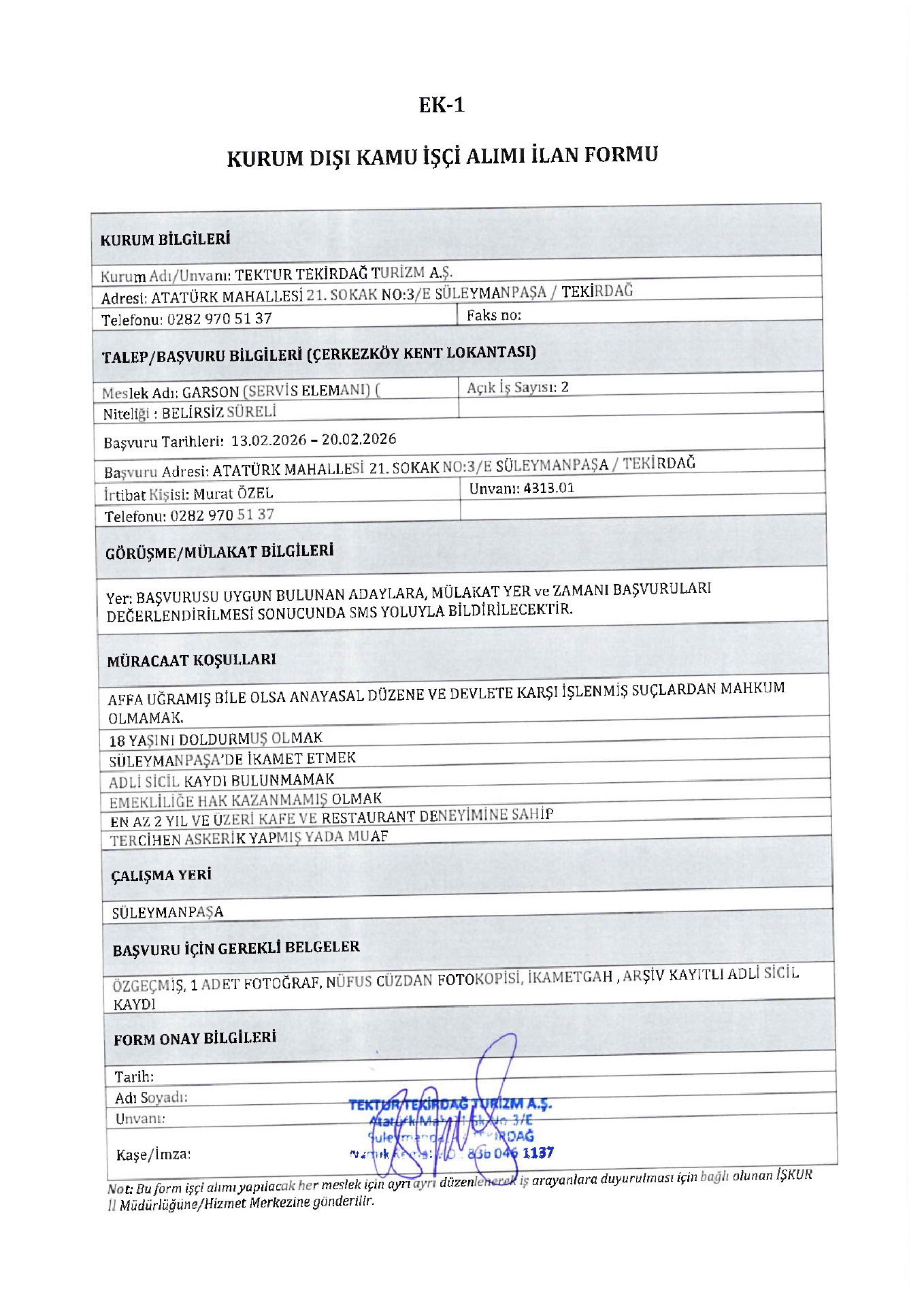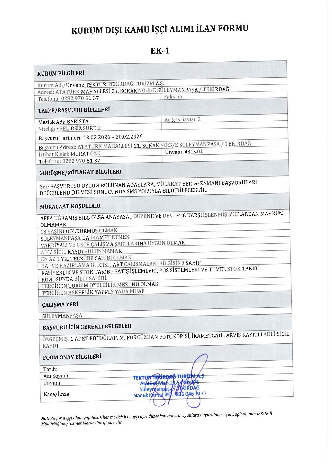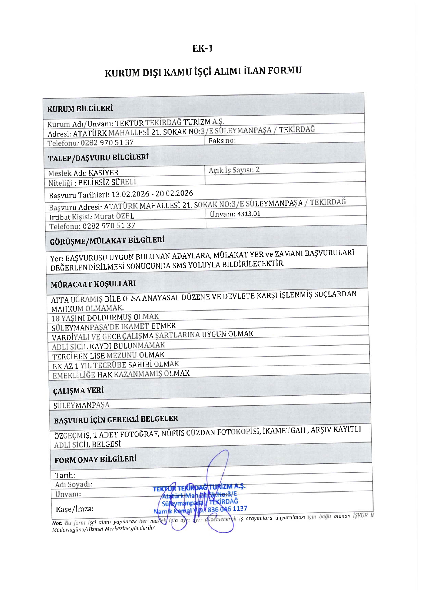 Tekirdağ Tektur 6 İşçi Alacak. Son başvuru tarihi 20 Şubat 2026