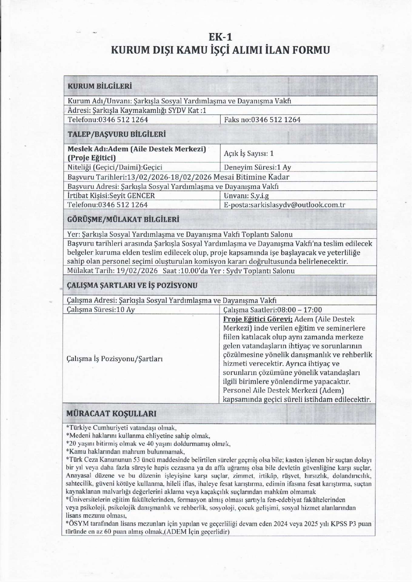 Ana sayfaSYDV İlanlarıAna sayfaGeçici İşçi İlanları Sivas Şarkışla SYDV Geçici 2 İşçi Alacak Sivas Şarkışla SYDV Geçici 2 İşçi Alacak. Son başvuru tarihi 18 Şubat 2026 Kaynak : İşkur İlan Giriş : 13 Şubat 2026 23:55, Son Güncelleme : 13 Şubat 2026 23:48 Yazdır Yorumlar (0) Abone Ol