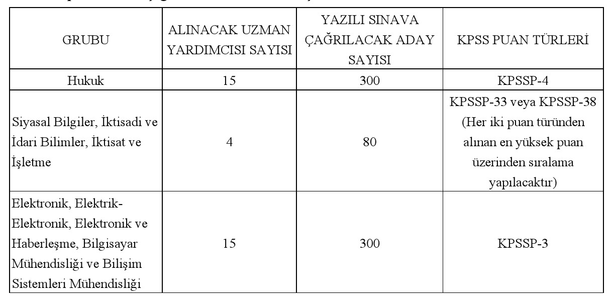 1.3. Alınacak uzman yardımcılarının öğrenim grubu, sayısı, sınava çağırılacak aday sayısı ve KPSS puan türleri aşağıdaki tabloda belirtilmiştir.