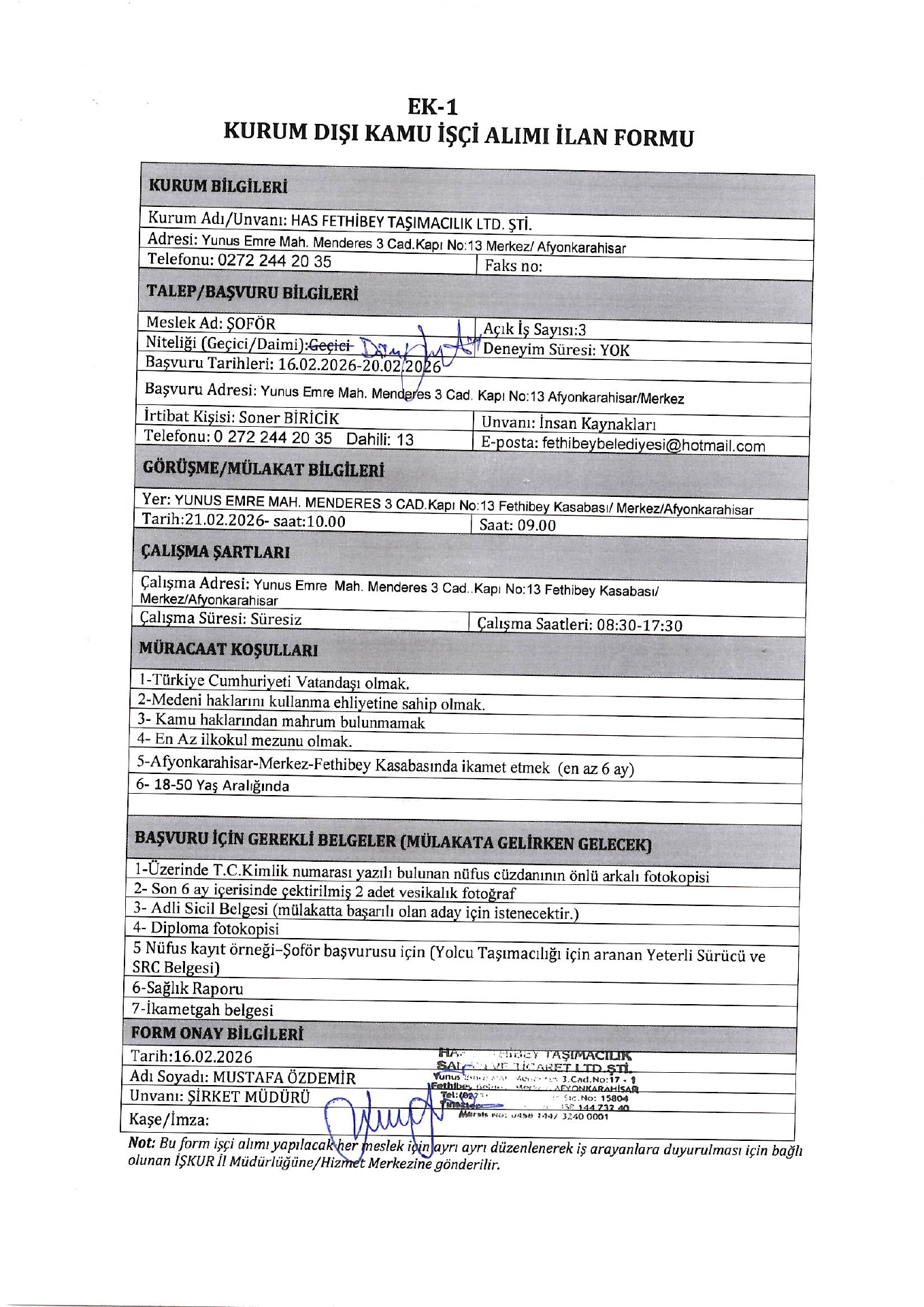 Afyonkarahisar Has Fethibey Taşımacılık Geçici 3 İşçi Alacak. Son başvuru tarihi 20 Şubat 2026
