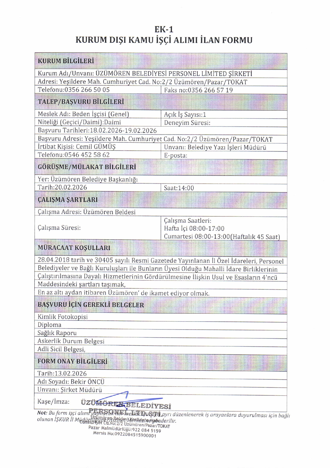 Ana sayfaDaimi İşçi İlanları Tokat Üzümören Belediyesi 1 İşçi Alacak Tokat Üzümören Belediyesi 1 İşçi Alacak. Son başvuru tarihi 19 Şubat 2026 Kaynak : İşkur İlan Giriş : 16 Şubat 2026 23:22, Son Güncelleme : 16 Şubat 2026 23:23 Yazdır Yorumlar (0) Abone Ol