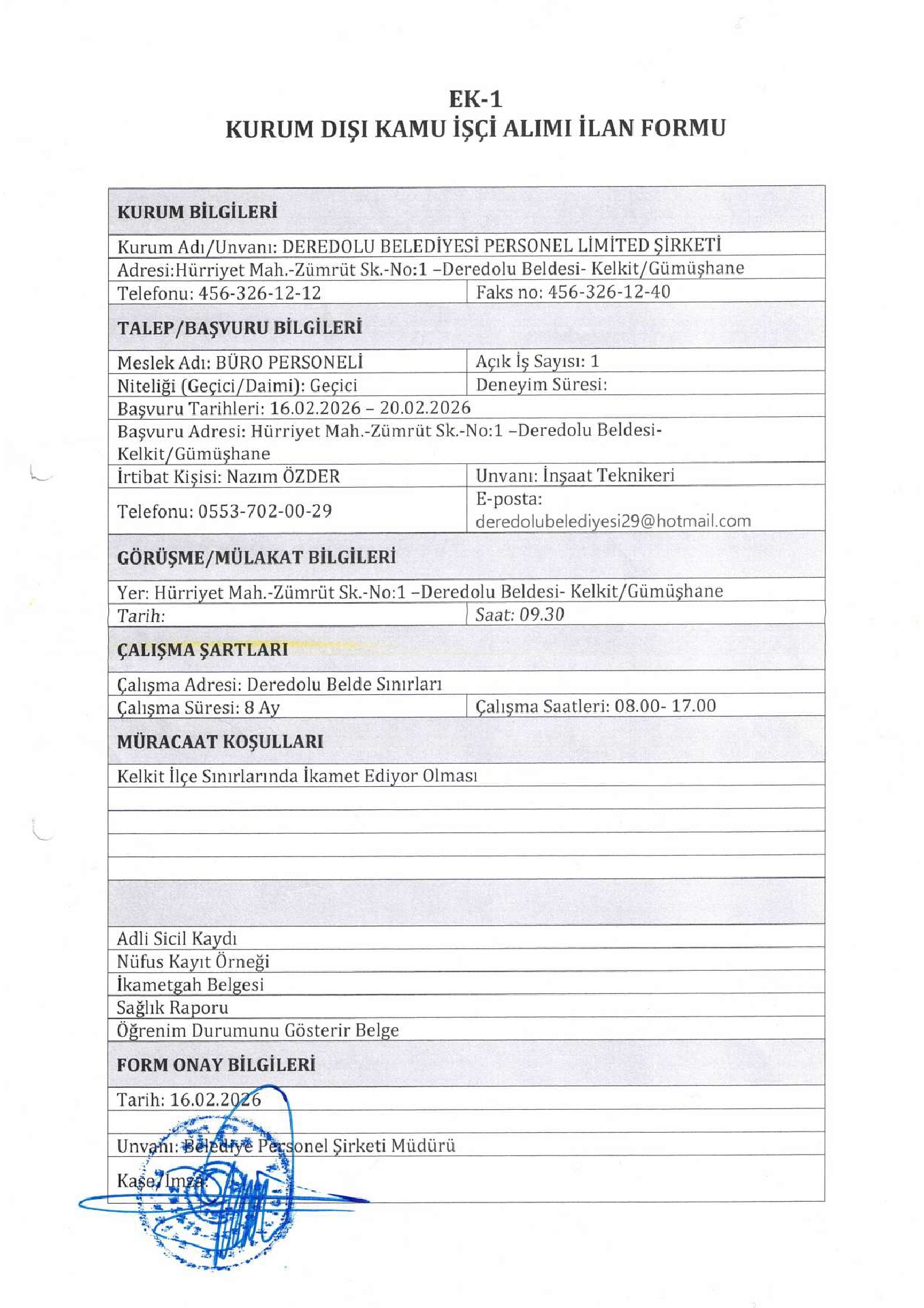 Ana sayfaGeçici İşçi İlanları Gümüşhane Deredolu Belediyesi Geçici 1 İşçi Alacak Gümüşhane Deredolu Belediyesi Geçici 1 İşçi Alacak. Son başvuru tarihi 20 Şubat 2026 Kaynak : İşkur İlan Giriş : 17 Şubat 2026 23:03, Son Güncelleme : 17 Şubat 2026 23:17 Yazdır Yorumlar (0) Abone Ol