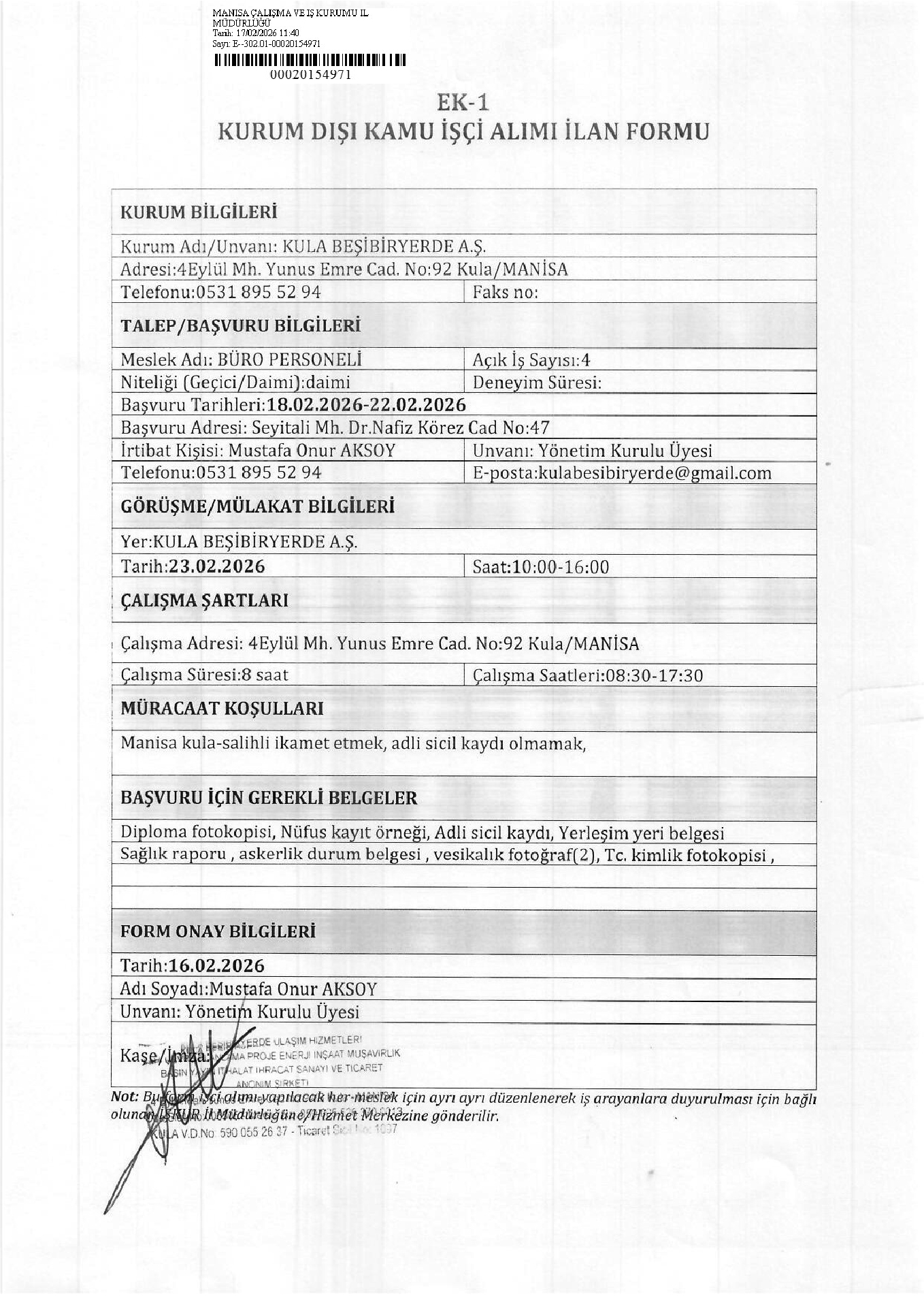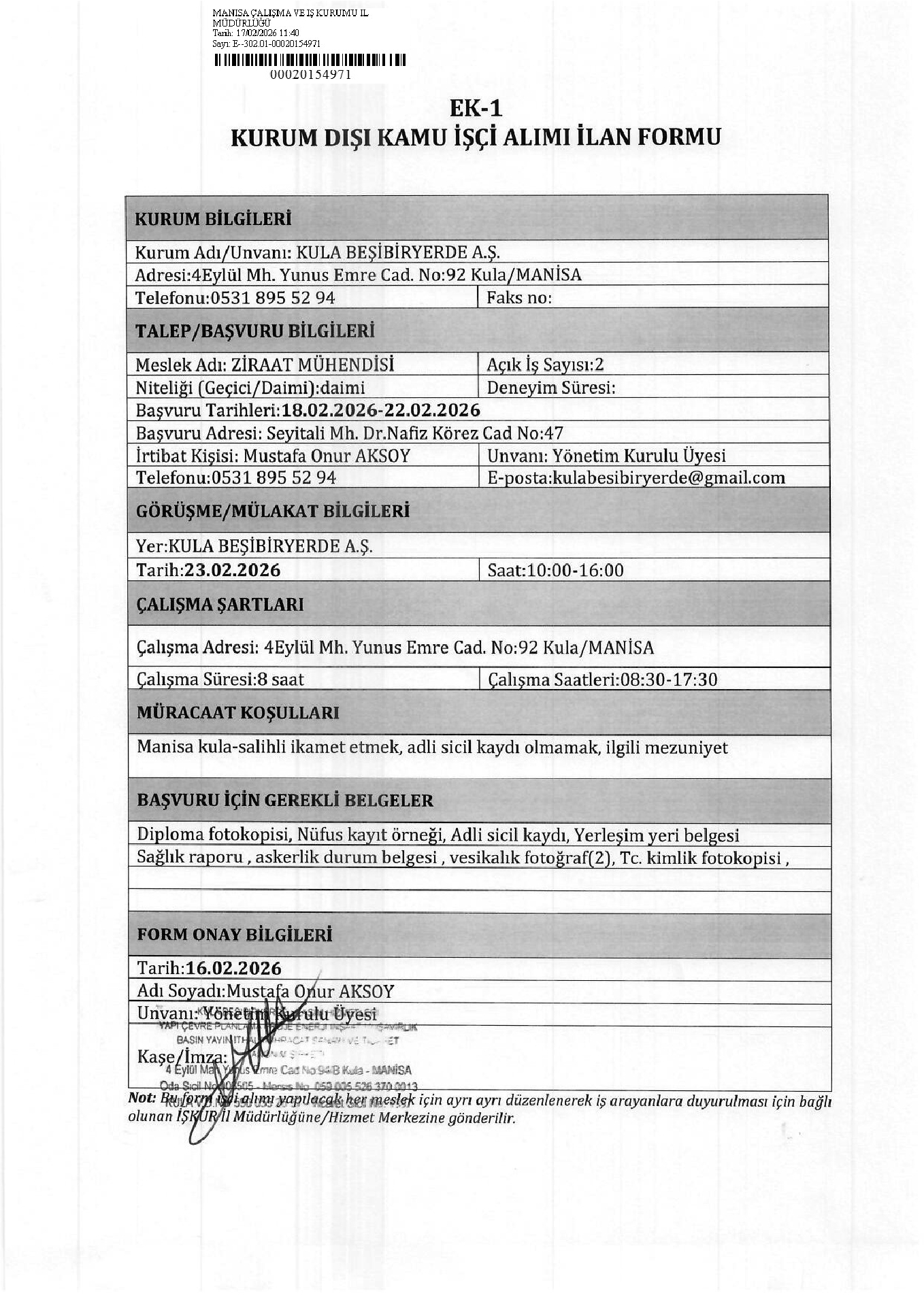 Ana sayfaDaimi İşçi İlanları Manisa Kula Beşibiryerde AŞ. 6 İşçi Alacak Manisa Kula Beşibiryerde AŞ. 6 İşçi Alacak. Son başvuru tarihi 22 Şubat 2026 Kaynak : İşkur İlan Giriş : 17 Şubat 2026 23:06, Son Güncelleme : 17 Şubat 2026 23:16 Yazdır Yorumlar (0) Abone Ol