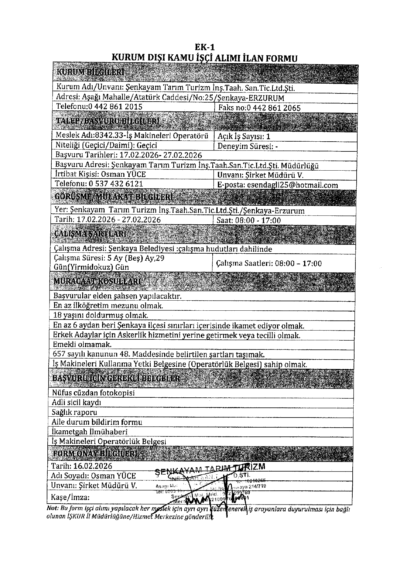 Ana sayfaGeçici İşçi İlanları Erzurum Şenkayam Tarım Geçici 1 İşçi Alacak Erzurum Şenkayam Tarım Geçici 1 İşçi Alacak. Son başvuru tarihi 27 Şubat 2026 Kaynak : İşkur İlan Giriş : 17 Şubat 2026 23:13, Son Güncelleme : 17 Şubat 2026 23:15 Yazdır Yorumlar (0) Abone Ol