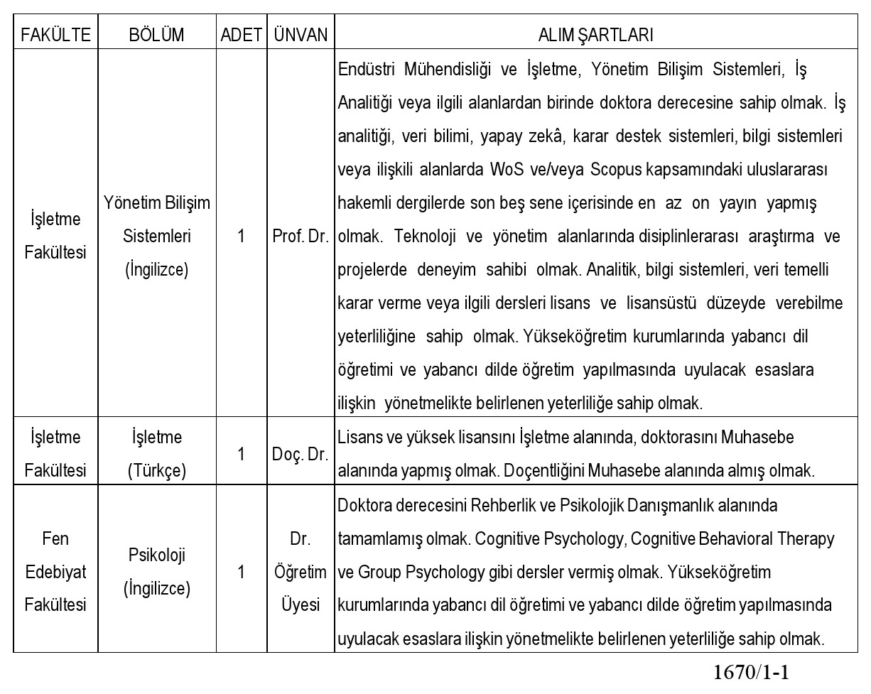 Üniversitemizin aşağıda belirtilen akademik birimlerine 2547 sayılı Yükseköğretim Kanunu ve Öğretim Üyeliğine Yükseltilme ve Atanma Yönetmeliği'nin ilgili maddeleri uyarınca, Üniversitemizin Akademik Birimlerine tam zamanlı öğretim üyeleri alınacaktır.