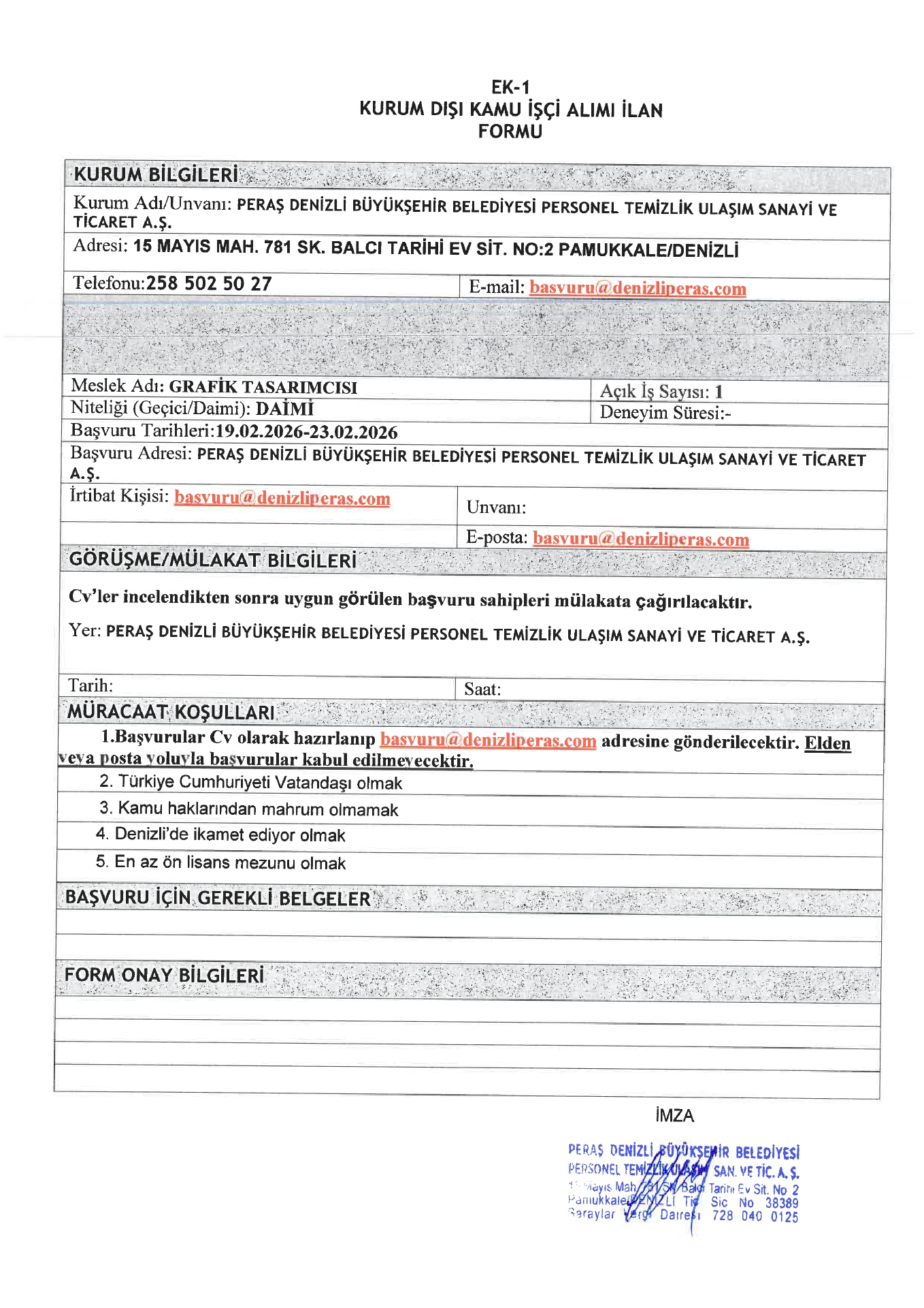 Ana sayfaDaimi İşçi İlanları Denizli Peraş 1 İşçi Alacak Denizli Peraş 1 İşçi Alacak. Son başvuru tarihi 23 Şubat 2026 Kaynak : İşkur İlan Giriş : 18 Şubat 2026 23:40, Son Güncelleme : 18 Şubat 2026 23:45 Yazdır Yorumlar (0) Abone Ol