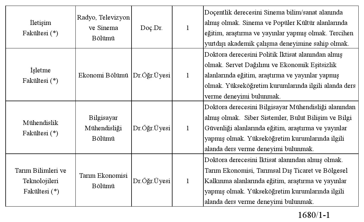 Üniversitemiz ilgili Birimlerine 2547 sayılı Kanun ile bu Kanuna dayanılarak Yükseköğretim Kurulu Başkanlığı'nca 12.06.2018 tarih ve 30449 sayılı Resmi Gazete'de yayımlanan "Öğretim Üyeliğine Yükseltilme ve Atanma Yönetmeliği", Üniversitemiz resmi erişim sayfasında yayımlanan "Akademik Kadrolara Atama ve Yükseltmeler Hakkında Yönerge"de belirtilen kıstasları yerine getirmiş olmak kaydıyla ilgili alanlarda uzmanlaşmış öğretim üyeleri alınacaktır.