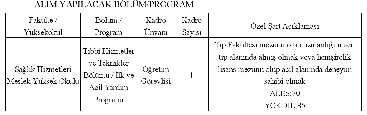 Üniversitemize aylık ve özlük hakları yönünden 4857 sayılı İş Kanunu hükümlerine tabi, tam zamanlı görev yapacak, 2547 sayılı Yükseköğretim Kanunu ve Öğretim Üyesi Dışındaki Öğretim Elemanı Kadrolarına Yapılacak Atamalarda Uygulanacak Merkezi Sınav ile Giriş Sınavına İlişkin Usul ve Esaslar Hakkında Yönetmelik gereğince öngörülen koşulları sağlamış olmak şartı ile öğretim elemanı alınacaktır.