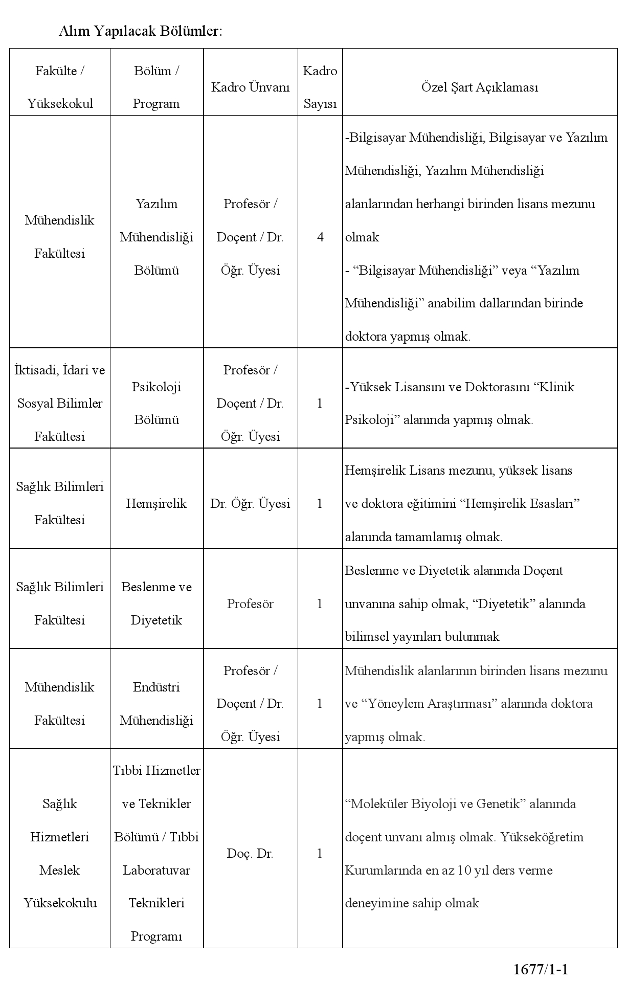 Üniversitemizin aşağıda belirtilmiş olan bölümlerine, aylık ve özlük hakları yönünden 4857 sayılı İş Kanunu hükümlerine tabi, tam zamanlı görev yapacak Profesör, Doçent, Dr. Öğr. Üyesi alınacaktır.