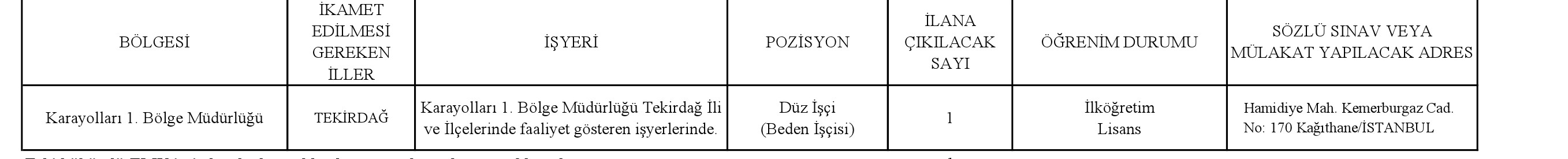 SÜRESİ BELİRLİ OLMAYAN SÜREKLİ İŞ SÖZLEŞMESİ İLE ÇALIŞTIRILMAK ÜZERE; TOPLAM 1 ESKİ HÜKÜMLÜ VEYA TERÖRLE MÜCADELEDE MALÜL SAYILMAYACAK ŞEKİLDE YARALANAN (TMY) İŞÇİ ALINACAKTIR.