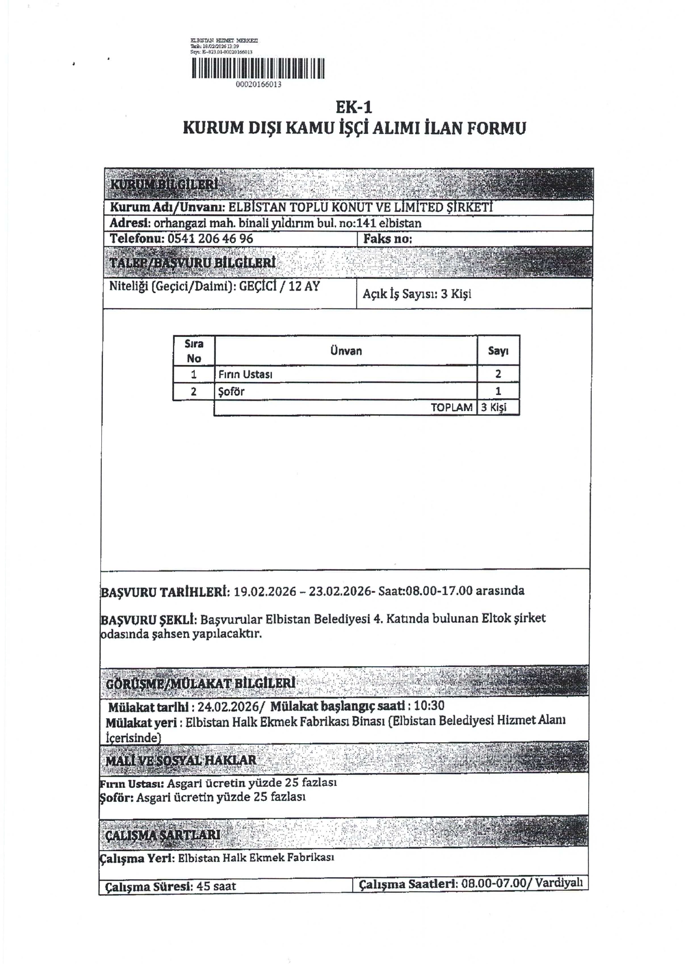 Kahramanmaraş Elbistan Toplu Konut Geçici 3 İşçi Alacak. Son başvuru tarihi 23 Şubat 2026