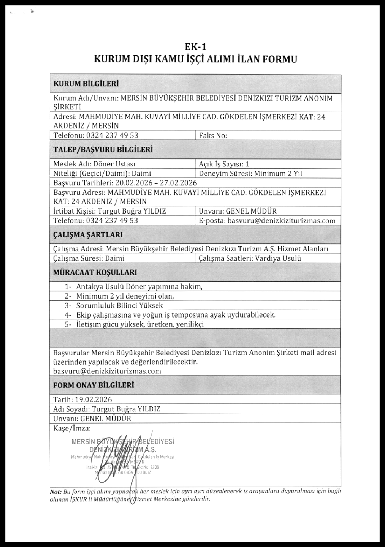 Mersin Büyükşehir Belediyesi 1 İşçi Alacak. Son başvuru tarihi 27 Şubat 2026