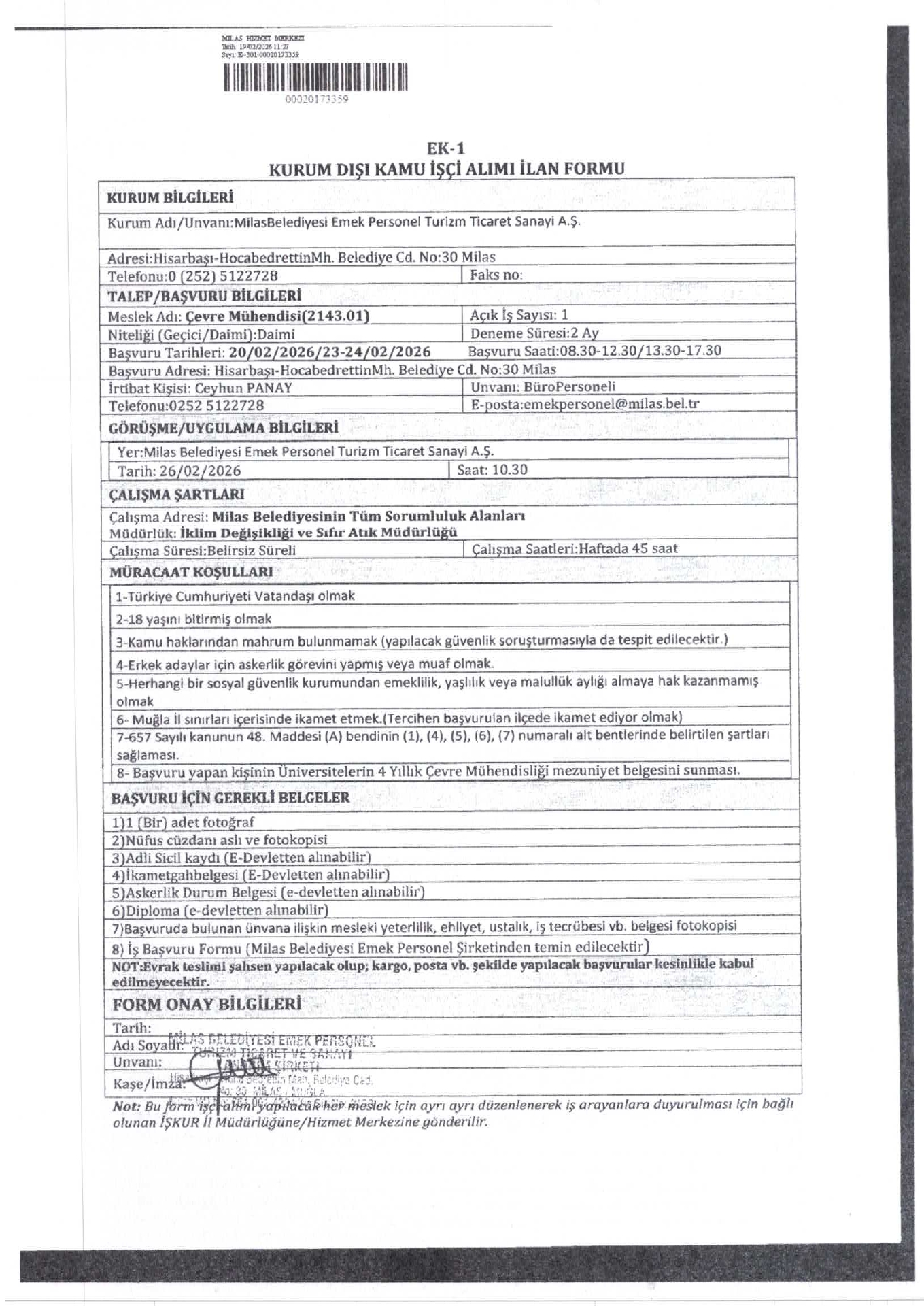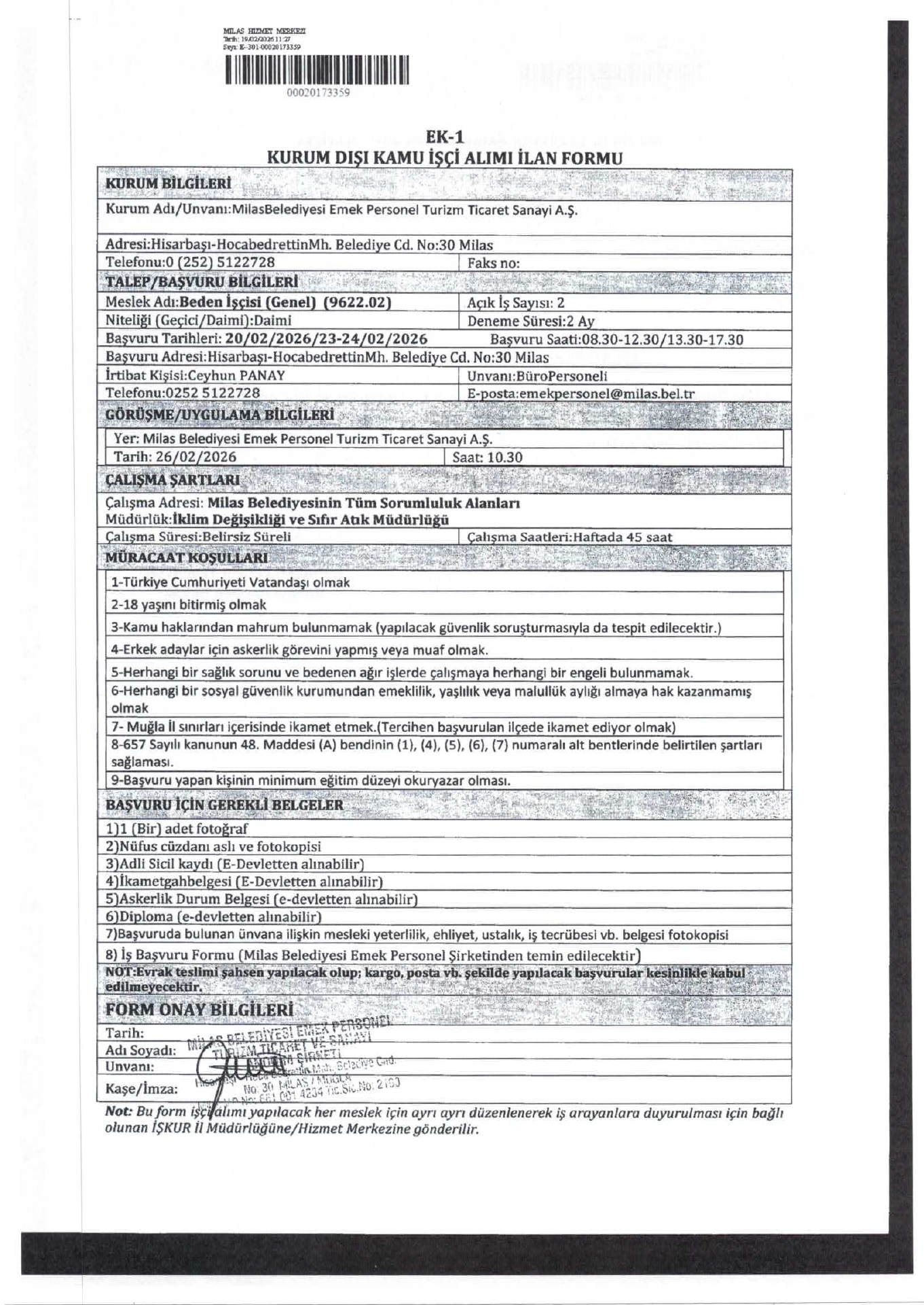 Ana sayfaDaimi İşçi İlanları Muğla Milas Belediyesi 3 İşçi Alacak Muğla Milas Belediyesi 3 İşçi Alacak. Son başvuru tarihi 24 Şubat 2026 Kaynak : İşkur İlan Giriş : 20 Şubat 2026 00:18, Son Güncelleme : 20 Şubat 2026 01:07 Yazdır Yorumlar (0) Abone Ol