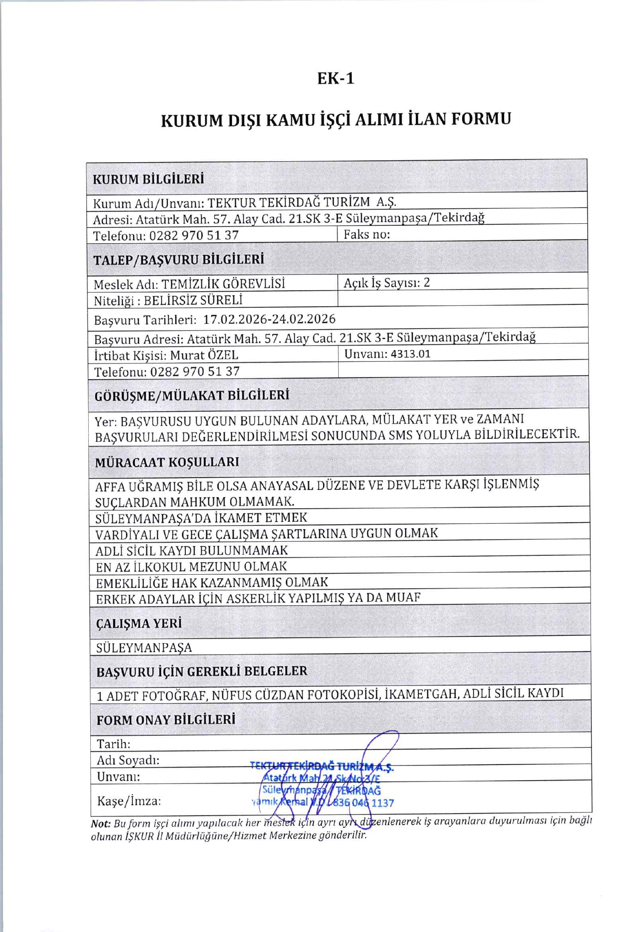 Ana sayfaDaimi İşçi İlanları Tekirdağ Tektur 2 İşçi Alacak Tekirdağ Tektur 2 İşçi Alacak. Son başvuru tarihi 24 Şubat 2026 Kaynak : İşkur İlan Giriş : 20 Şubat 2026 00:25, Son Güncelleme : 20 Şubat 2026 01:05 Yazdır Yorumlar (0) Abone Ol