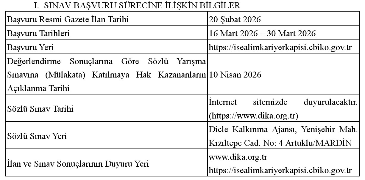 Başvurular, belirtilen tarihlerde https://isealimkariyerkapisi.cbiko.gov.tr adresinde bulunan Dicle Kalkınma Ajansı sınav başvuru bağlantısından yapılacaktır.