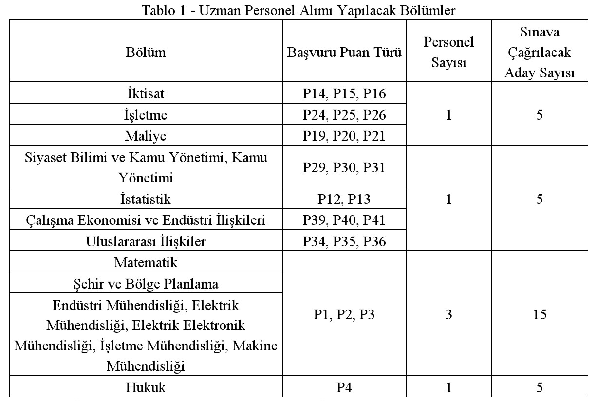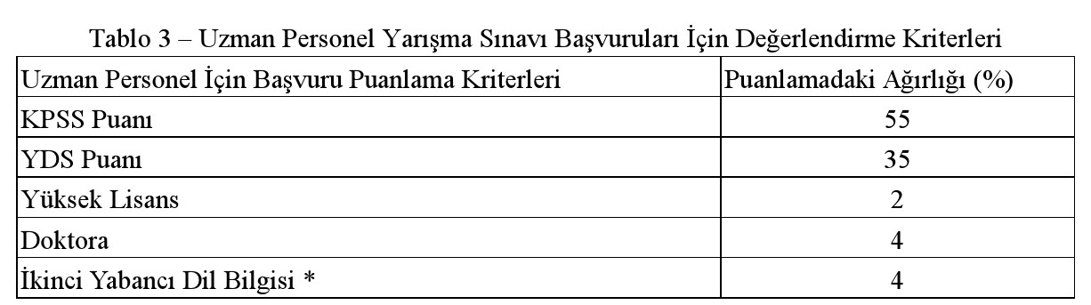 Uzman olarak görev almak isteyen adaylar, KPSS puanı şartları ile belirlenen pozisyonlardan durumlarına uygun olan birine başvurabileceklerdir. Uzman pozisyonuna başvuranlar için Tablo 3'te yer alan kriterler doğrultusunda Genel Sekreterlikçe oluşturulan başvuru değerlendirme komisyonunca değerlendirme yapılacak ve puan sıralamasına göre istihdam edilecek personel sayısının 5 katı oranında en yüksek puanlı adaylar sözlü yarışma sınavına çağırılacaktır. Son sıradaki adayla eşit puandaki diğer adaylar da sınava katılmaya hak kazanacaktır.
