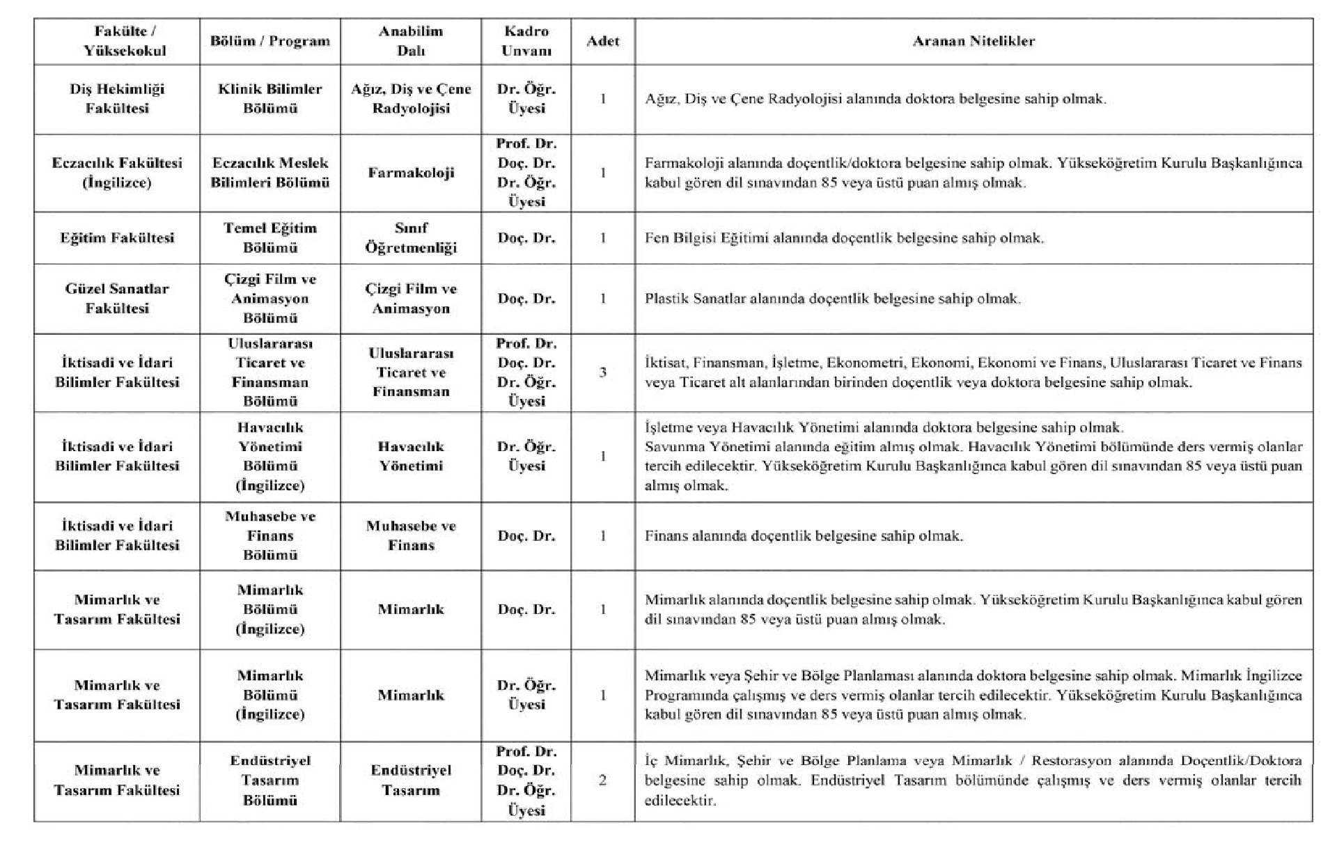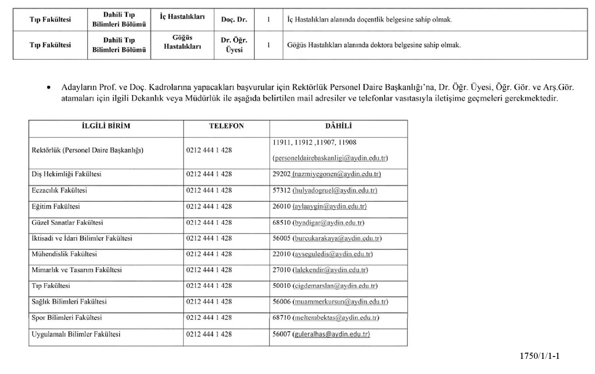 üniversitemize 2547 sayılı Yükseköğretim Kanunu ile Öğretim Üyeliğine Yükseltilme ve Atanma Yönetmelik'in ilgili maddeleri ve 4857 sayılı İş Kanunu hükümlerine göre tam zamanlı Öğretim Üyesi alınacaktır. Profesör, Doçent ve Dr öğr. Üyesi kadrosuna başvuracakların "İstanbul Aydın üniversitesi Akademik Atama ve Yükseltme Kriterlerini" sağlaması gerekmektedir.