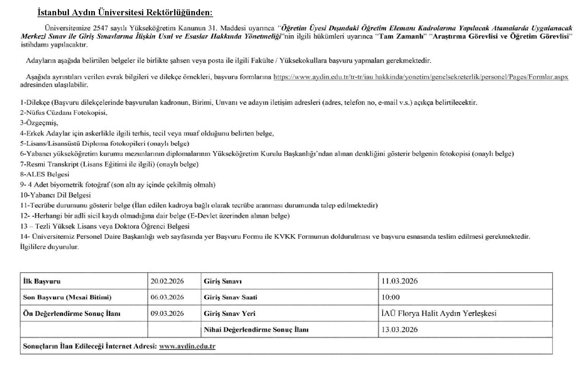 İstanbul Aydın Üniversitesi Öğretim Üyesi ve Elemanı Alım İlanı. Son başvuru tarihi 6 Mart 2026