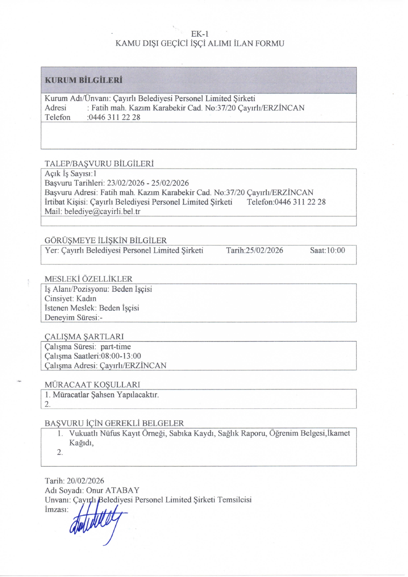 Ana sayfaGeçici İşçi İlanları Erzincan Çayırlı Belediyesi Geçici 1 İşçi Alacak Erzincan Çayırlı Belediyesi Geçici 1 İşçi Alacak. Son başvuru tarihi 25 Şubat 2026 Kaynak : İşkur İlan Giriş : 20 Şubat 2026 23:45, Son Güncelleme : 21 Şubat 2026 02:48 Yazdır Yorumlar (0) Abone Ol