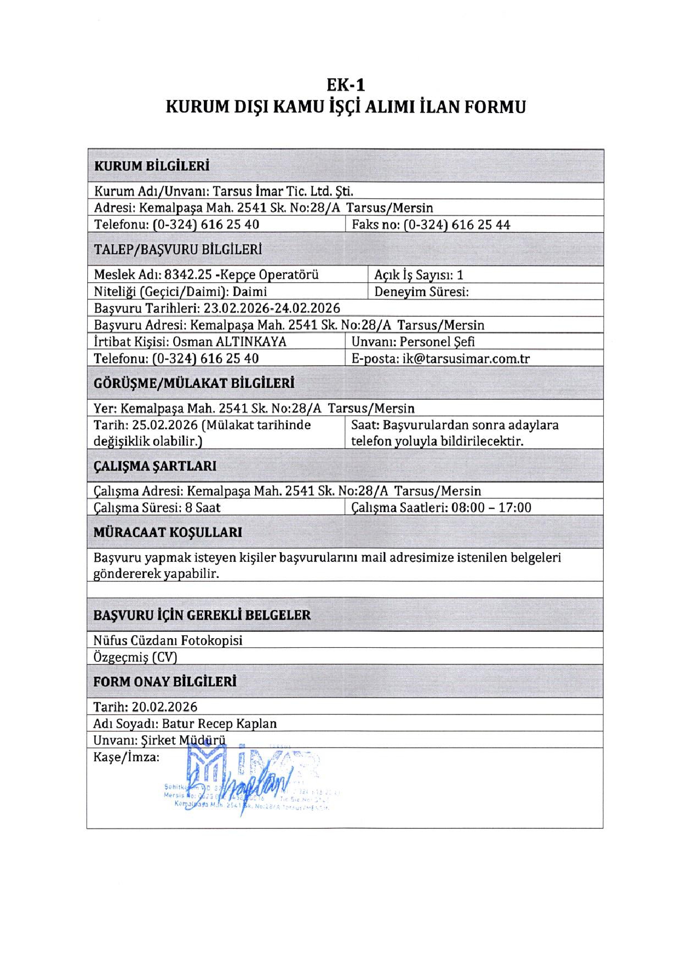 Ana sayfaDaimi İşçi İlanları Mersin Tarsus İmar 1 İşçi Alacak Mersin Tarsus İmar 1 İşçi Alacak. Son başvuru tarihi 24 Şubat 2026 Kaynak : İşkur İlan Giriş : 21 Şubat 2026 00:15, Son Güncelleme : 21 Şubat 2026 02:41 Yazdır Yorumlar (0) Abone Ol