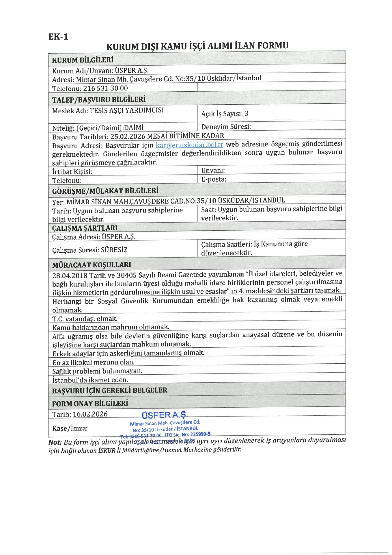 Ana sayfaDaimi İşçi İlanları İstanbul Üsküdar Belediyesi 3 İşçi Alacak İstanbul Üsküdar Belediyesi 3 İşçi Alacak. Son başvuru tarihi 25 Şubat 2026 Kaynak : İşkur İlan Giriş : 21 Şubat 2026 00:18, Son Güncelleme : 21 Şubat 2026 02:40 Yazdır Yorumlar (0) Abone Ol