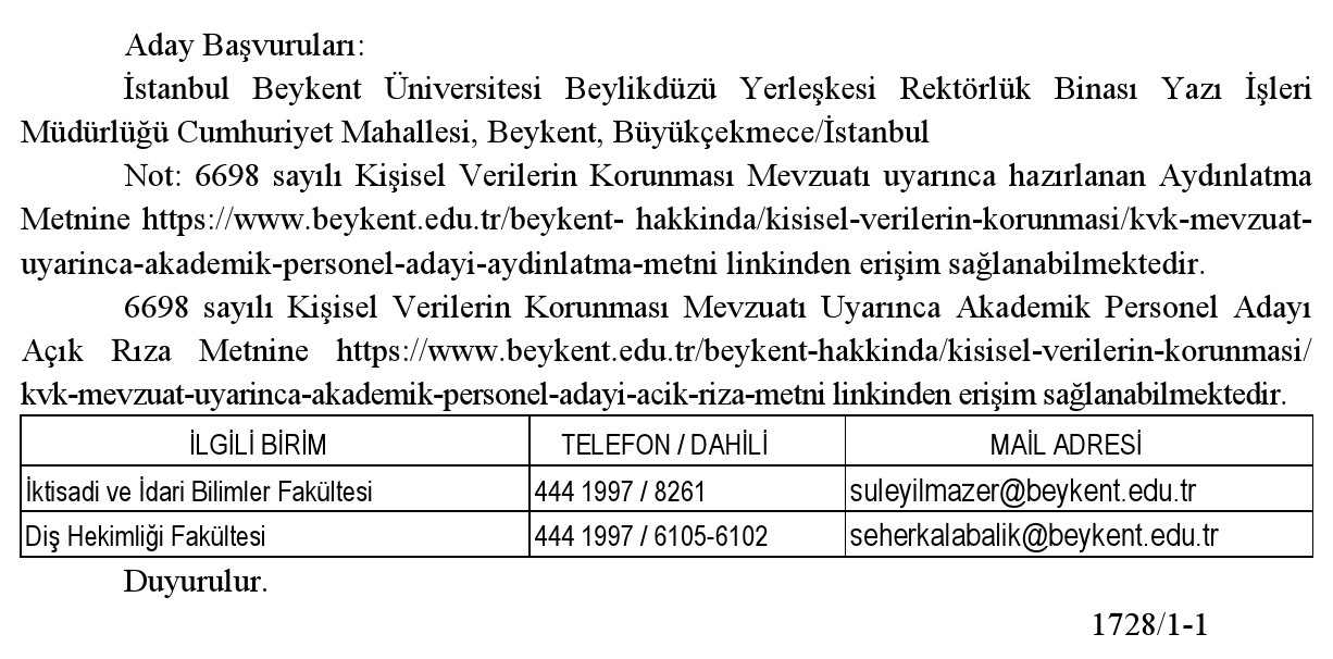 Başvurular bu ilanın Resmi Gazete'de yayım tarihinden itibaren 15 gün içinde İstanbul Beykent Üniversitesi Yazı İşleri Müdürlüğü'ne şahsen veya posta aracılığı ile yapılabilir. Postadaki gecikmeler ve eksik belge ile yapılan başvurular dikkate alınmaz. İnternet üzerinden başvurular kabul edilmez. Başvuru için gerekli belgeler ve diğer tamamlayıcı bilgiler ilgili birimlerden öğrenilecektir. Adayların aşağıda belirtilen genel koşullara ek olarak tabloda yer alan özel koşulları da sağlamaları gerekmektedir. Belirtilen şartları taşımayan ve alan dışı olan başvurular dikkate alınmayacaktır.