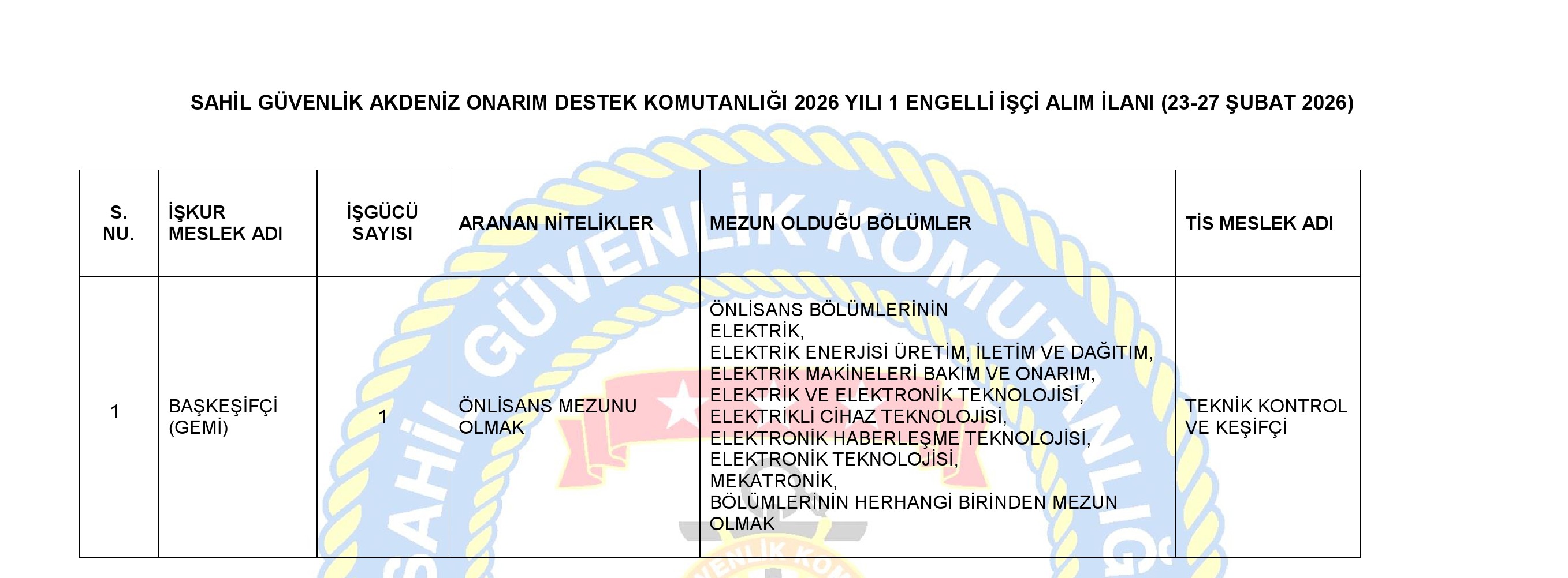 SAHİL GÜVENLİK AKDENİZ ONARIM DESTEK KOMUTANLIĞI 2026 YILI 1 ENGELLİ İŞÇİ ALIM İLANI (23-27 ŞUBAT 2026)
