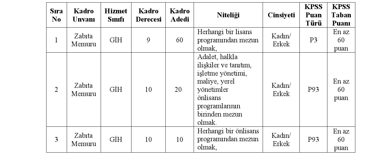 Antalya Büyükşehir Belediye Başkanlığı bünyesinde, 657 sayılı Devlet Memurları Kanununa tabi olarak istihdam edilmek üzere; Belediye Zabıta Yönetmeliği hükümlerine göre aşağıda unvanı, sınıfı, derecesi, adedi, nitelikleri, KPSS puan türü, KPSS taban puanı ve diğer şartları taşımak kaydıyla belirtilen boş kadrolara açıktan atama yoluyla zabıta memuru alınacaktır.