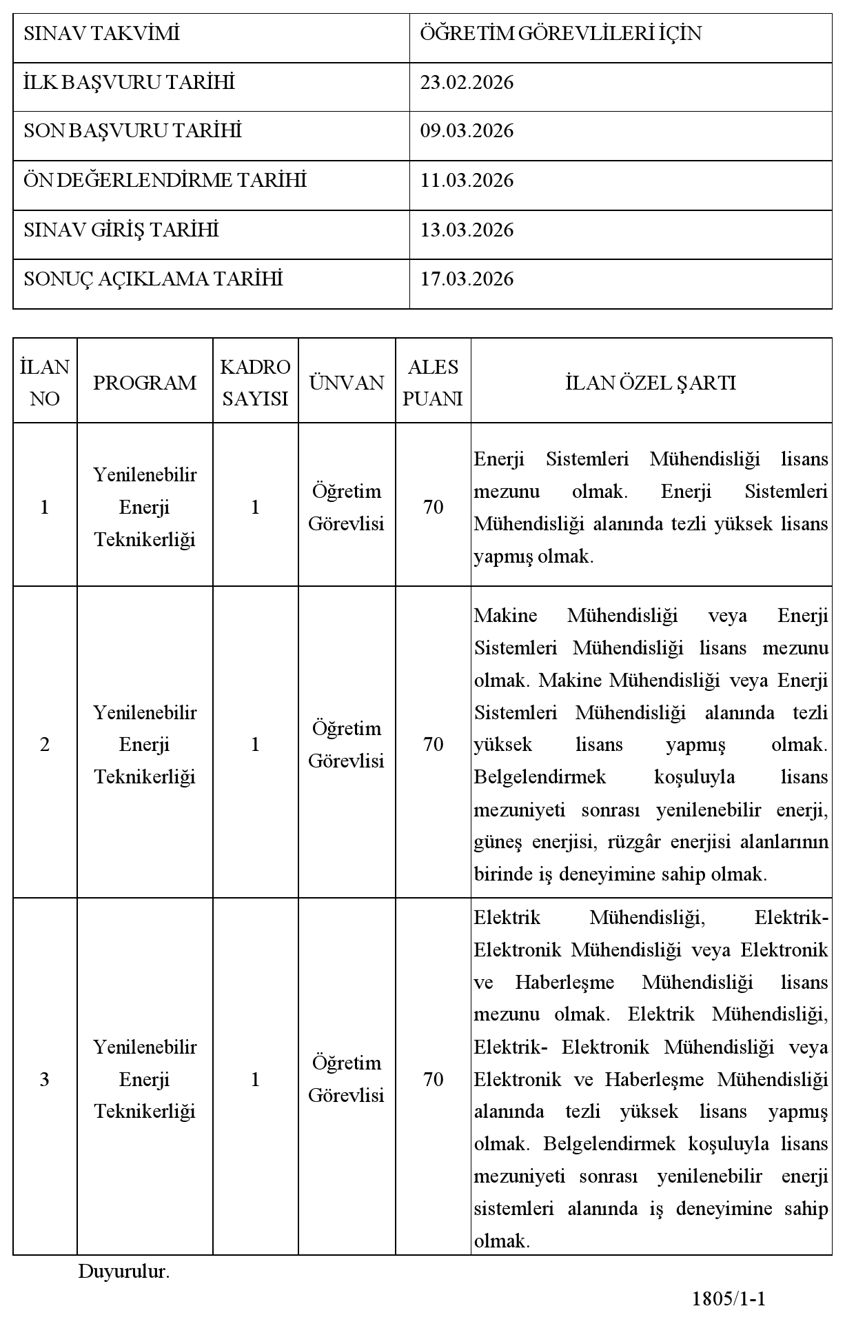 2- Öğretim üyesi dışındaki öğretim elemanı kadrolarına yapılacak atamalarda ilgili mezuniyet bölümünden ALES' ten en az 70 puan almış olmak