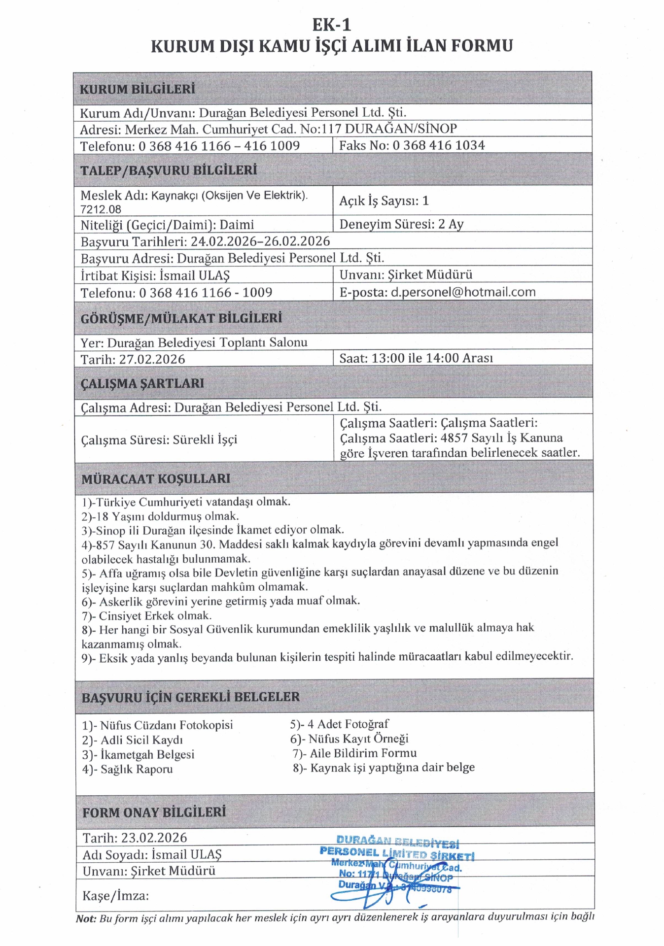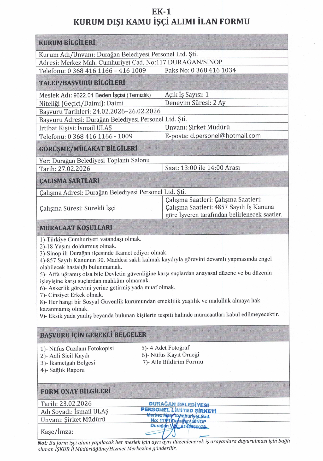 Ana sayfaDaimi İşçi İlanları Sinop Durağan Belediyesi 1 İşçi Alacak Sinop Durağan Belediyesi 1 İşçi Alacak. Son başvuru tarihi 26 Şubat 2026 Kaynak : İşkur İlan Giriş : 23 Şubat 2026 23:10, Son Güncelleme : 23 Şubat 2026 23:48 Yazdır Yorumlar (0) Abone Ol