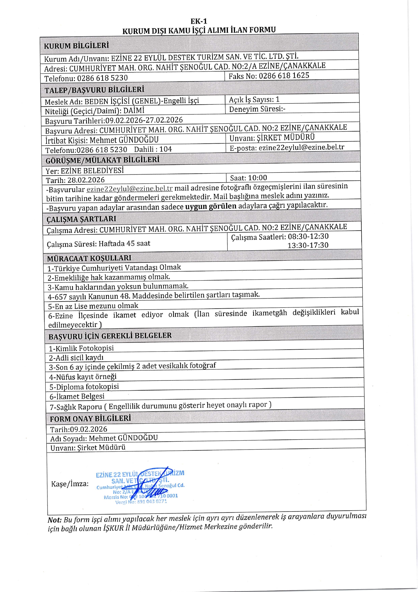 Ana sayfaDaimi İşçi İlanları Çanakkale Ezine 22 Eylül Destek Turizm 1 İşçi Alacak Çanakkale Ezine 22 Eylül Destek Turizm 1 İşçi Alacak. Son başvuru tarihi 27 Şubat 2026 Kaynak : İşkur İlan Giriş : 23 Şubat 2026 23:16, Son Güncelleme : 23 Şubat 2026 23:46 Yazdır Yorumlar (0) Abone Ol