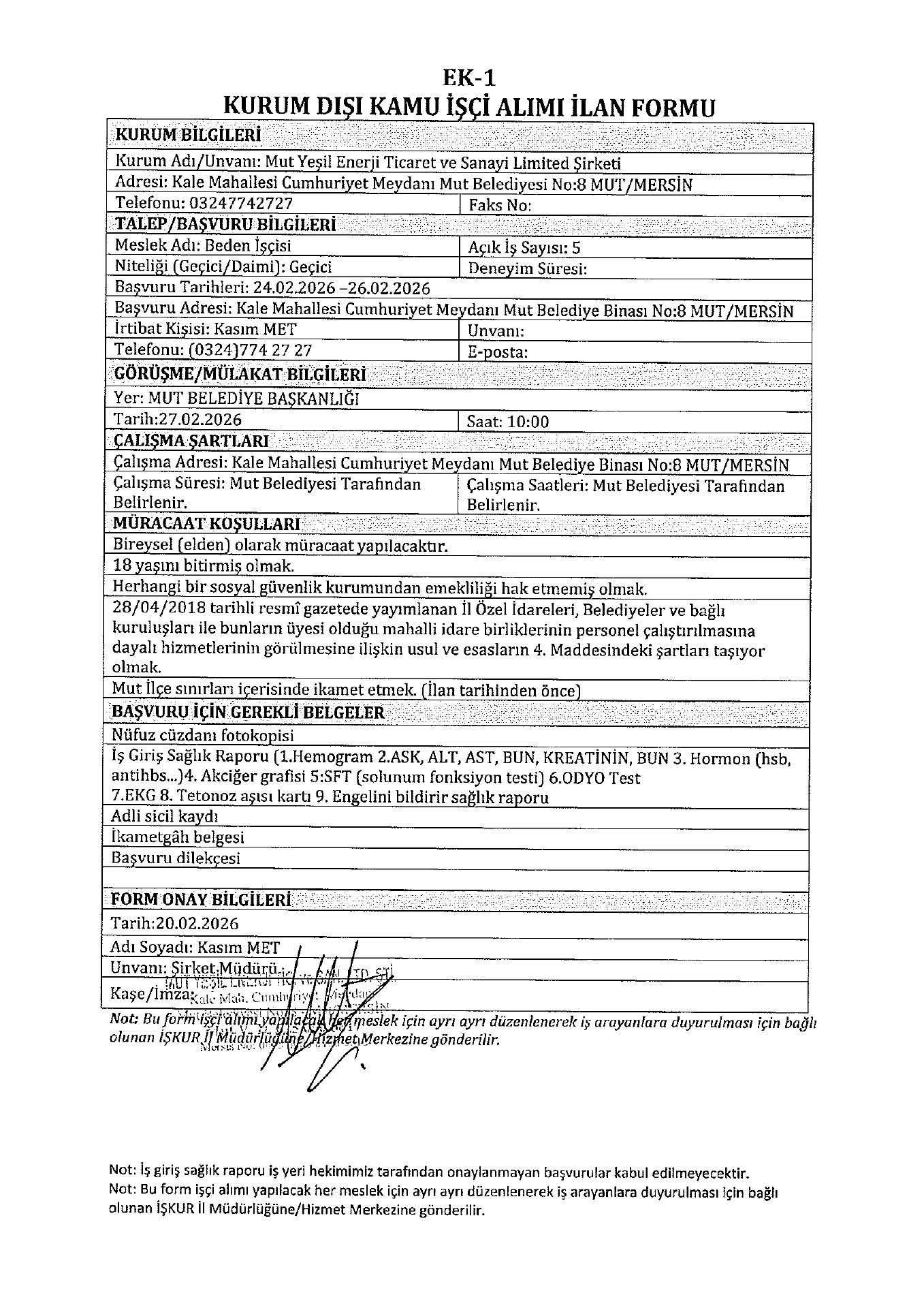 Ana sayfaGeçici İşçi İlanları Mersin Mut Yeşil Enerji Geçici 5 İşçi Alacak Mersin Mut Yeşil Enerji Geçici 5 İşçi Alacak. Son başvuru tarihi 26 Şubat 2026 Kaynak : İşkur İlan Giriş : 23 Şubat 2026 23:30, Son Güncelleme : 23 Şubat 2026 23:43 Yazdır Yorumlar (0) Abone Ol