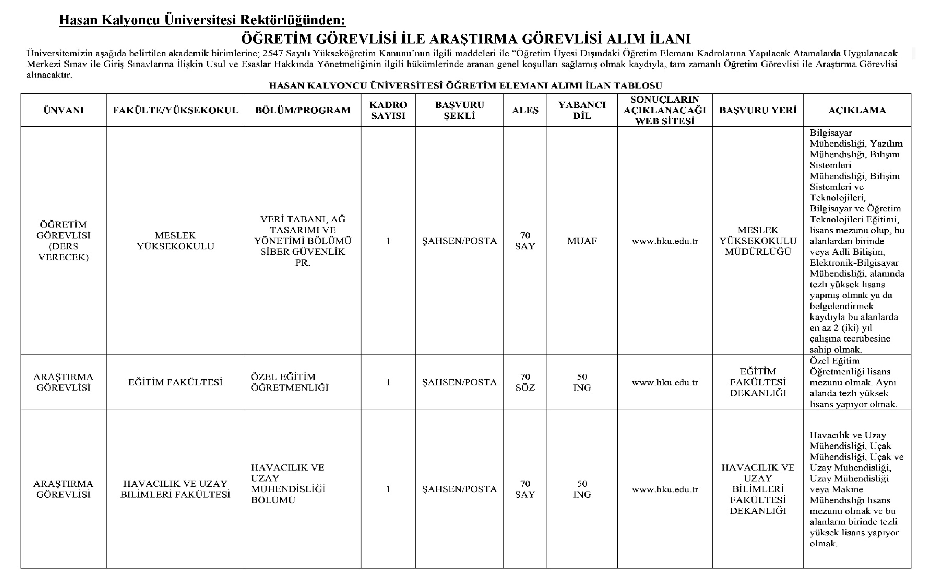 Hasan Kalyoncu Üniversitesi Öğretim Üyesi ve Elemanı Alım İlanı. Son başvuru tarihi 10 Mart 2026
