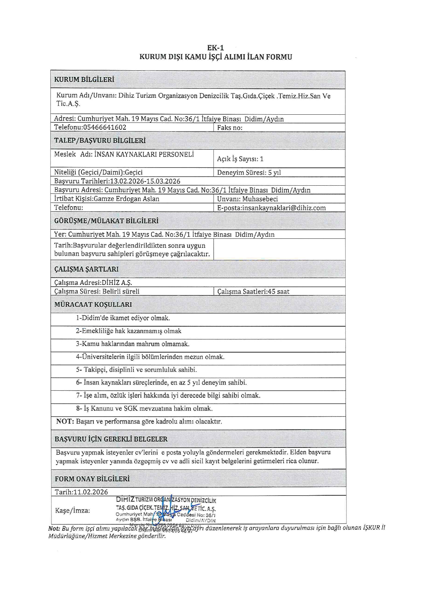 Aydın Dihiz Turizm Geçici 1 İşçi Alacak. Son başvuru tarihi 15 Mart 2026