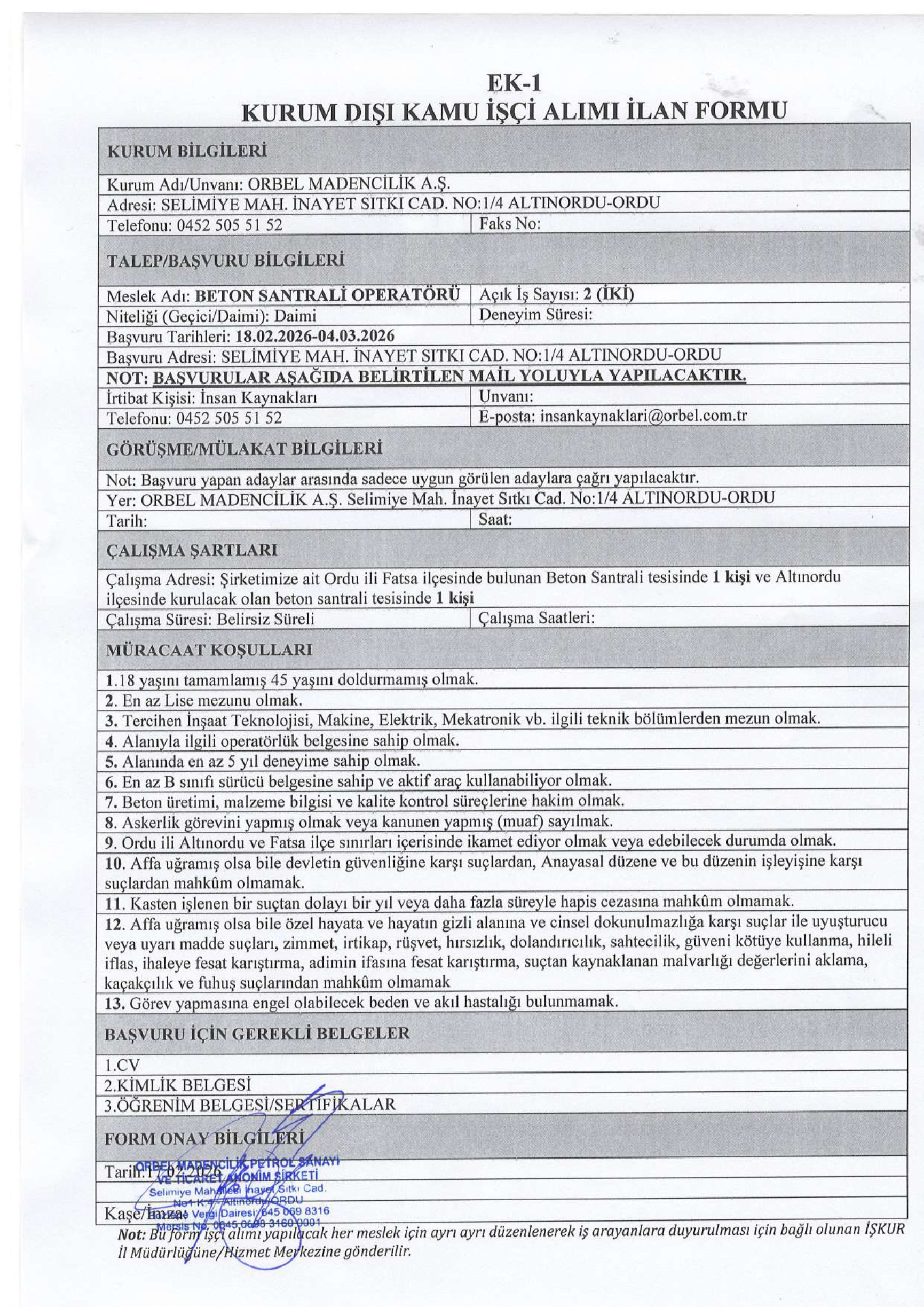 Ana sayfaDaimi İşçi İlanları Ordu Orbel 2 İşçi Alacak Ordu Orbel 2 İşçi Alacak. Son başvuru tarihi 4 Mart 2026 Kaynak : İşkur İlan Giriş : 24 Şubat 2026 23:22, Son Güncelleme : 24 Şubat 2026 23:05 Yazdır Yorumlar (0) Abone Ol